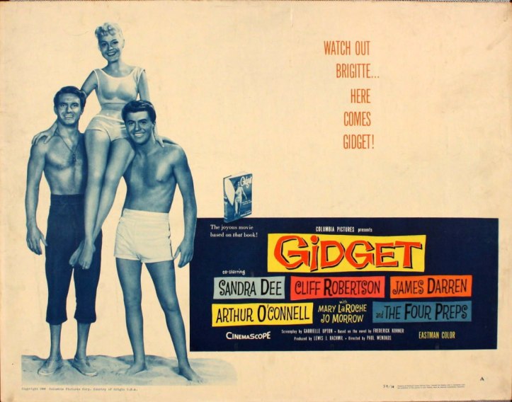 The film Gidget, released by Columbia in 1959, is landmark in a way that few films can be landmark. It was truly a first: Hollywood’s first surf movie. Putting “Hollywood” and “surfing” together is anathema to any true, self-respecting surfer. Real surfers bemoan the release of Gidget, and blame it for exploiting their wave-riding lifestyle and causing a glut of “hodads” and “gremmies” (wannabes) on any and all beaches where there were breaking waves. The Beach Boys and American International’s “beach party” movies soon followed. Gidget and a true phenomenon was born. Surfers have long been hostile to an industry that depicts them as Spicoli-types: stoned vagrants who contribute zero but instead leech off society. They point to films like Fast Times at Ridgemont High and Point Break as failures in Hollywood’s attempt  to portray the surfing lifestyle. But this is no fault of Gidget‘s. The 1959 film is truly engaging. It made stars of Sandra Dee and James Darren, boasted a cast of notables such as Cliff Robertson in the iconic role of Kahuna, Arthur O’Connell, Yvonne Craig, Joby Baker and Tom Laughlin. More than just a surfing movie, it is a delightful slice of life circa 1959. Suburban homes, front yards, living rooms, Saturday nights. A lovely time capsule. The beach scenes are also great images of the summertime living of the era. The requisite burger stand sits atop the hill. Beach goers descend and come upon the surfer’s enclave: Stinky’s surfboard ‘shaping bay’ sits next to the Kahuna’s shack. Inside is all you’d ever need: exotic pictures on the wall, cot, chair and hot plate with coffee pot. Outside, the boys loiter, waiting for surf. Reclining in a hammock, playing chess, plinking on a ukulele or beating a drum. With these indelible images, you could watch with the sound down and still be enthralled.