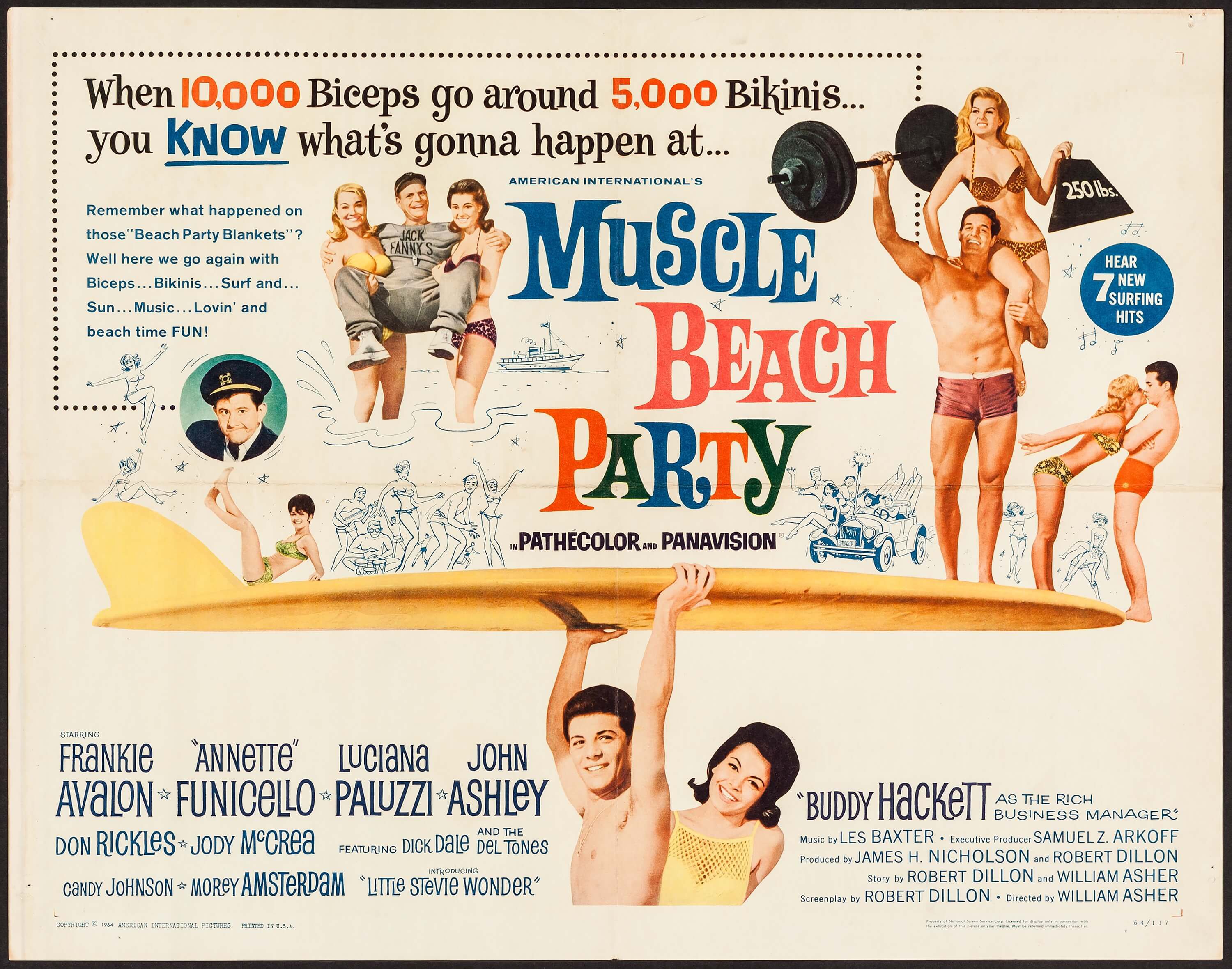 I discovered the Beach Boys when I was 12 years old. Soon I began to grow enamored of mid-century Southern Californian culture in it’s entirety. This quickly and obviously led me to the beach party movies, especially those produced by American-International Studios in the early-to-mid 1960’s. The first film I discovered in this genre was 1964’s Muscle Beach Party. On a personal note, I had taped it off TV when it was broadcast on the late, late show on CITY-TV in Toronto where I grew up. It was part of their line-up of Not So Great Movies. You often hear people say “I’ve watched that movie 100 times!”. While I may not have seen Muscle Beach Party 100 times, I must’ve watched that video tape dozens of times.