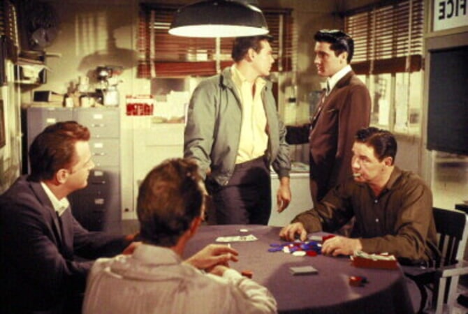 Danny gets in trouble gambling with some shady types including Red West, far left. John Daheim is at far right. He played the tough guy Elvis killed in a bar brawl in Jailhouse Rock (1957).