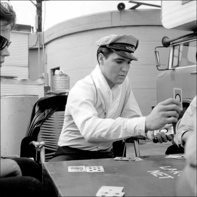 Elvis plays cards with the boys on set.
