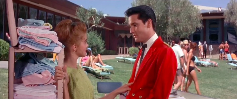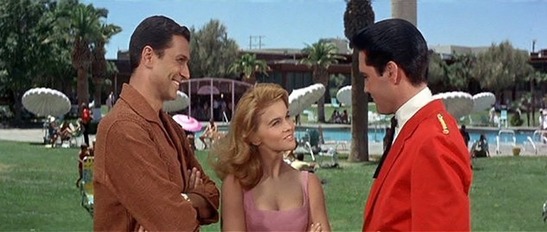 So, you can also subtract the time it takes for these numbers to play out; although I’ll concede that “subtracting” music from a King Movie is daft as that is what they are about. But my point is that there are many things going on in this movie besides story, if you can even call it a story. Director George Sidney has said that the script was written in eleven days. The film employs the “travelogue” technique of many of Presley’s films by showing many scenes of Las Vegas itself. Many of the hotel’s shows are displayed when Lucky looks for Rusty and Rusty provides commentary when she and Lucky tool around the area in a helicopter. All this must have pleased the Vegas Chamber of Commerce. This shouldn’t be a great movie but it is. And that all comes back to the chemistry between King and Rusty. She also had a codename that King and his court would refer to her by so that outsiders within earshot (Priscilla?) wouldn’t know who they were talking about – “Thumper”. Sigh.