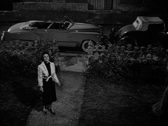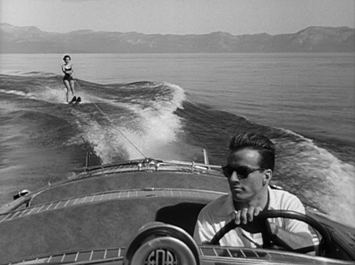 When George returns to Angela, he’s wearing black and she’s in white. The gang goes boating and we see the little black radio that is reporting the dark side of George’s life and white sails symbolizing George’s dreams of a life of leisure. We hear the news report of Alice’s death but parts of it are drowned out by the roaring speedboat as if George, at the wheel of this toy, can muffle and suppress what has happened. A futile attempt. The last time George sees Angela – before the last time – he is in his black leather jacket and she is in white. She goes into the house – and closes the door on him.