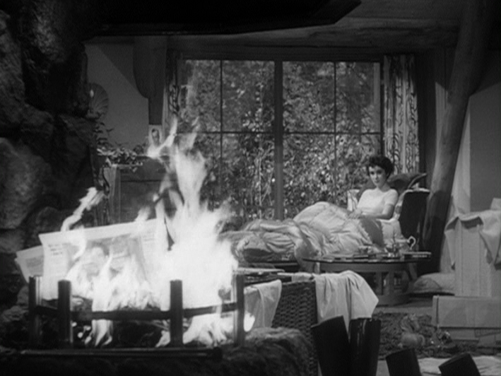 Canadian Raymond Burr plays District Attorney R. Frank Marlowe. He wears a white hat with a black band. The news about George and Alice has hit Angela hard; Liz executes one of the best faints in movie history. George Stevens is not done, though, giving us compelling shots. As Angela ponders the collapse of her world, Stevens shoots Liz through the flames of the fireplace, heavily symbolic of the state of affairs. There is also a female juror who seems to be looking into George’s soul. And when Angela attempts to focus in class upon her return to school, we see her tuning out while the teacher drones on. And what is the teacher saying? “…the student will emerge from the shelter of life into a world of grown-up problems for the first time…the enthusiasms of youth…genuine problems as opposed to the imagined problems which are the frequent products of a sheltered immaturity. It is at this time that the sometimes hastily adopted beliefs of youth are found to be insufficient.” Angela’s youth and immaturity have come to an abrupt end.