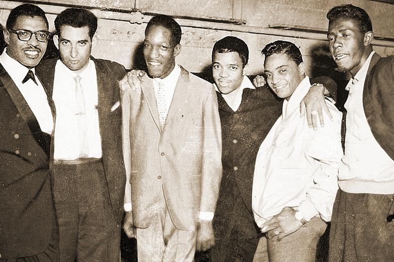 An early snap of Berry Gordy, third from right, with his arm around his man, Jackie Wilson. Also with, from left to right, Billy Johnson, Al Abrams, Johnny (“JJ”) Jones and Robert Bateman. Jewish teenager Abrams was a promoter, the first salaried employee of Motown. Thanks to jackiewilsonlover.wordpress.com for identifying these men.
