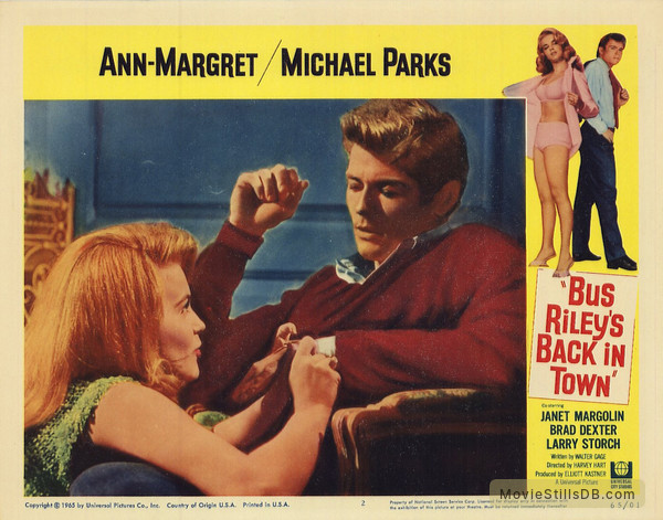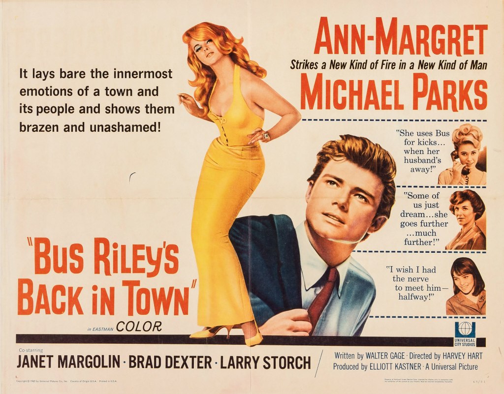 By 1965, Ann-Margret was a star, a star quickly being labelled a “sex kitten”. After a demure debut in Pocketful of Miracles (1961), she appeared somewhat more seductive – Pat Boone never stood a chance – in State Fair (1962) and then made a splash as effervescent teenager Kim in Bye Bye Birdie (1963). Then her obvious physical appeal was promoted, first opposite our boy, Presley, in Viva Las Vegas (1964) and then in two more from that same year; the provocatively titled Kitten With a Whip and the suggestively titled The Pleasure Seekers. Her character in Bus Riley had one purpose; to be sexy, to be seductive and to lure Bus into her web.
