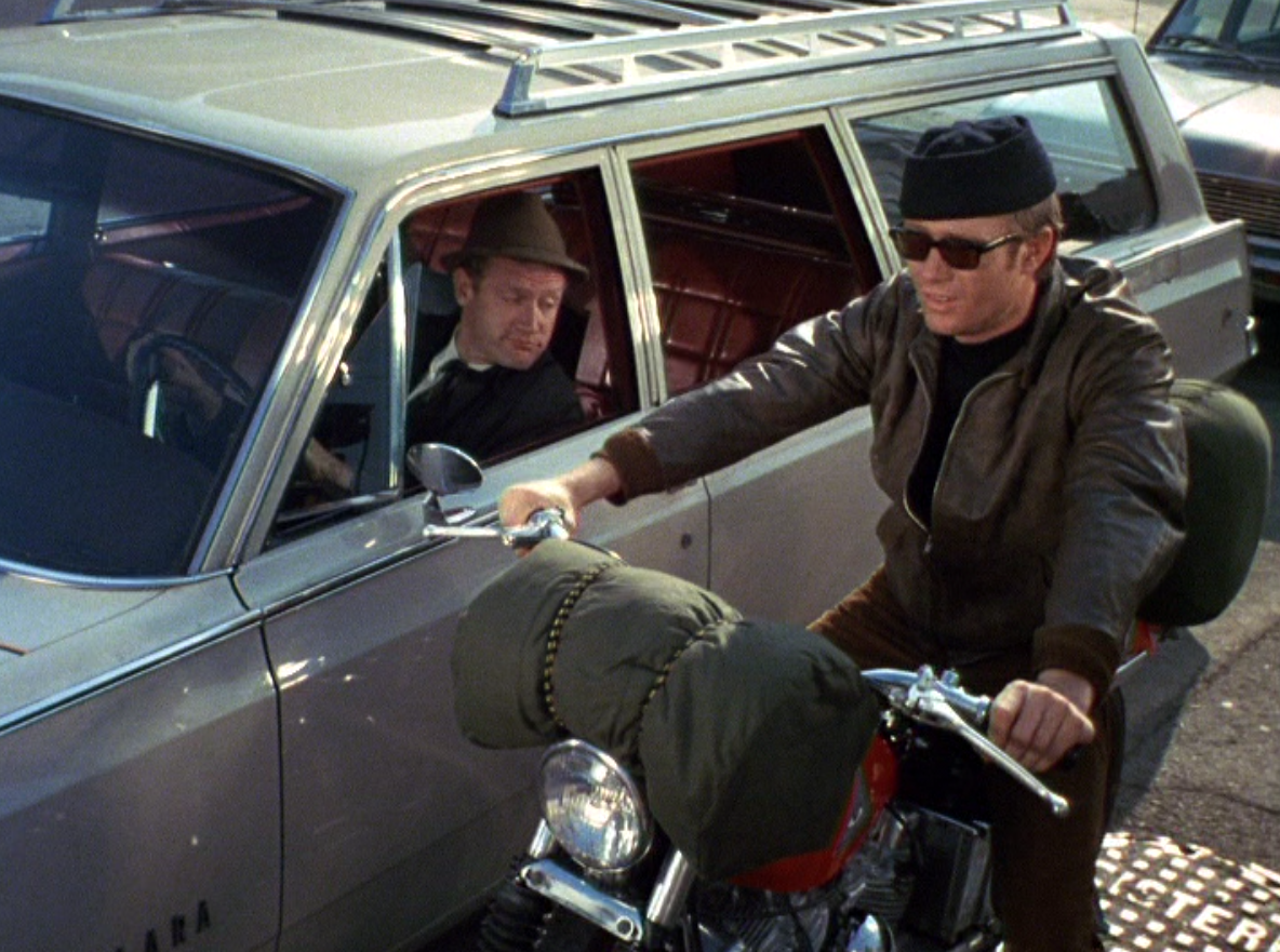 Jim goes to visit Nick’s widow, Gloria (North). She is distraught and laments the poverty she has been living in while Nick spends outrageously on his bike. Jim comforts her, gives her a cheque for Nick’s bike and leaves. He reports back to his boss at the paper (Freed) and gets a reprimand for being off the job the last few hours. When Jim explains, Editor Carson isn’t having it. He tells Bronson that going forward he will toe the line and do as he is told or he can hit the road. Jim hits the road. He talks one last time with Inspector Otis and Jim tells him he’s taking off. Otis bids him farewell; “Tomorrow is the first day of the rest of your life”. Jim packs up and heads out. Before leaving the city, Jim is stopped at a stop light. The weary driver of a station wagon (Klitsner) next to him looks longingly at Jim, his bedroll and his bike.