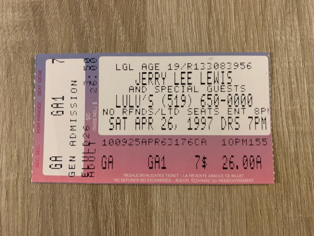 I saw Jerry Lee Lewis live at Lulu’s Roadhouse on April 26, 1997. The place was once home to the longest bar in the world and was known for the legends that performed there. I saw the Fabulous Thunderbirds, Mitch Ryder and Rare Earth there, as well. Jerry was late getting to the piano; he didn’t appear until about 11:30pm. He was surly from the get-go and when someone took his picture he protested. When the flashbulbs wouldn’t stop, he blew up and cut the show short. I think he sang about 5 songs and was on stage maybe 15 minutes.
