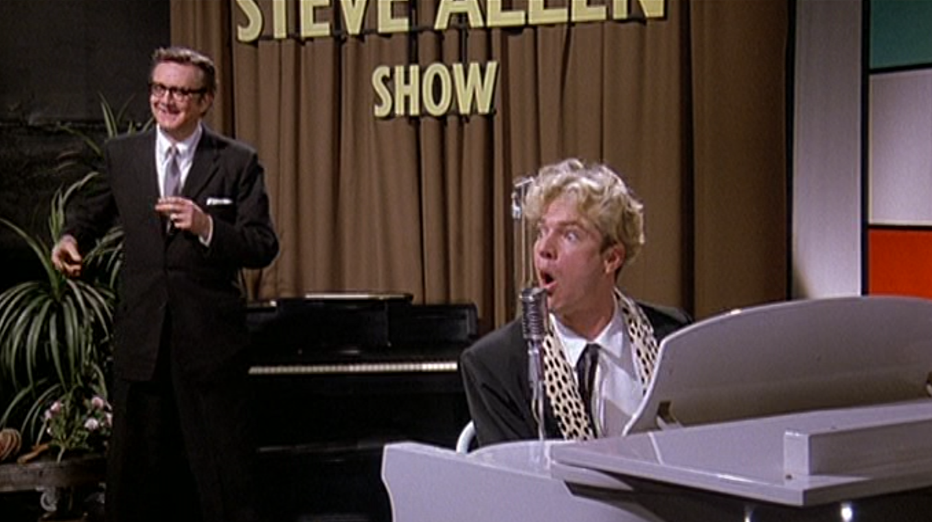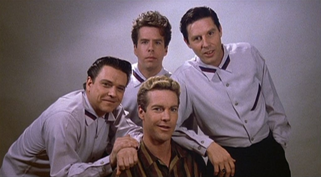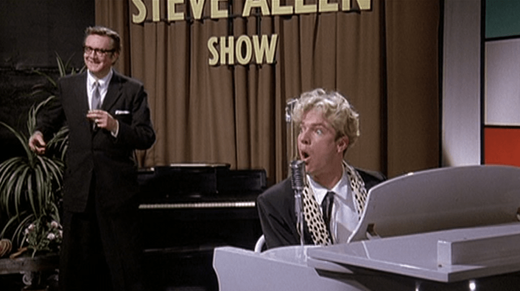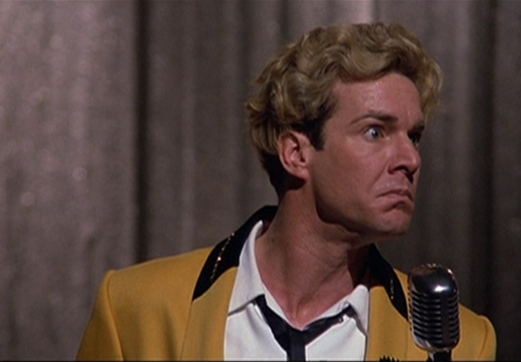 Lisa Blount is a knockout as Myra’s mom, Lois. Blount was an actress of little note who had been nominated for a Golden Globe for her work in An Officer and a Gentleman (1982). I know her from an episode of one of my three favourite television shows, Moonlighting. While she forged no significant career as an actress, she did gain notices in 2005’s Chrystal, a film she made with Billy Bob Thornton and her husband, actor, writer, director and producer Ray McKinnon, and for the short film The Accountant. Blount and her husband won the Best Short Subject Academy Award in 2001 for this film they made with actor/producer Walter Goggins (of the Tarantinoverse). Blount suffered from Immune thrombocytopenic purpura, a condition of the blood that contributed to her premature death at 53 in 2010. Sadly, her mother discovered her after she had been dead for two days. In clever casting, musicians Jimmie Vaughan and Mojo Nixon portray members of Jerry’s band and Lisa Jane Persky shows up as an ardent fan of Jerry’s who snips off a lock of his hair. Persky – also from When Harry Met Sally… – was in The Big Easy with Quaid. And we’ll talk about this more later but Michael St. Gerard portrays Elvis Presley. St. Gerard looked so much like Presley that he played him in the 1990 Elvis mini-series, this and another film and an episode of Quantum Leap. He stands out in my world for his portrayal of an acting teacher during the second season of Beverly Hills, 90210. What his character’s name was on that show I couldn’t tell you; I always referred to him as “the King teacher”. Not long for acting, St. Gerard is now a pastor working with inner-city kids in Harlem. Points for Michael St. Gerard. Watch for Steve Allen playing his younger self hosting his eponymous television variety show.