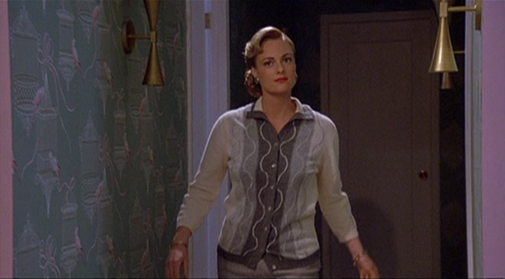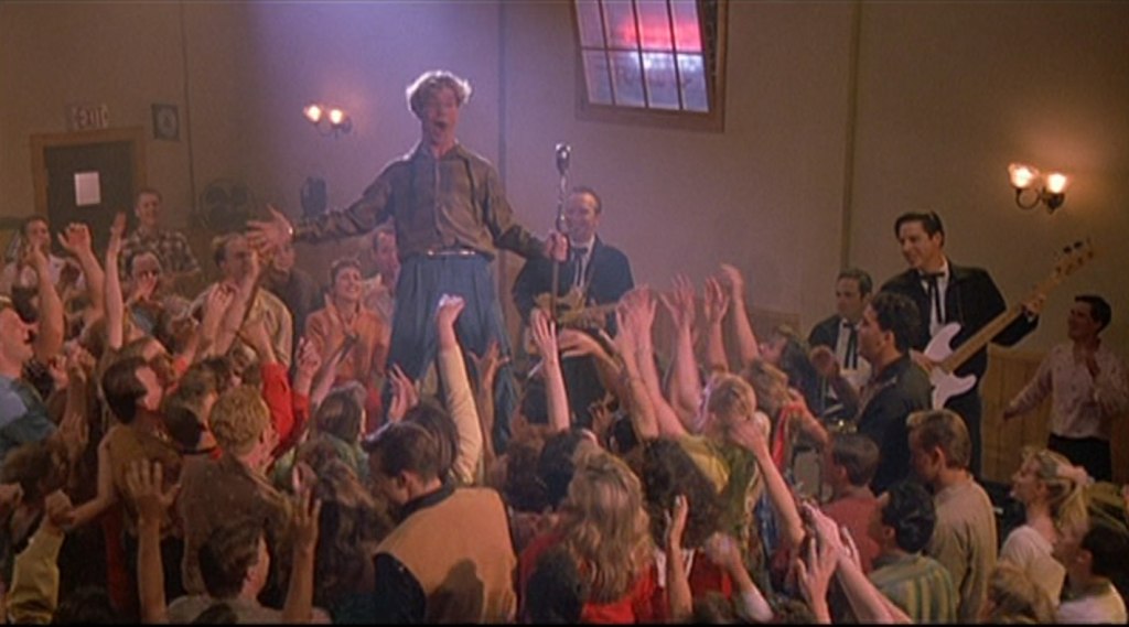 The movie is saved in part by this element which has to do with the film’s general tenor and an understanding of Quaid’s depiction of Lewis. Expectations have killed many a great film and if you are going into this one looking for a dramatic rock & roll movie about a dynamic performer and his controversial private life, that is not what you’re going to get. Not really. A recent viewing allowed me to see this movie for what I think it is; a fun, tongue-in-cheek, self-aware picture. I think you need to watch it more as a Grease-type musical, half-a-send-up of the Fifties aesthetic. Consider particularly the “High School Confidential” number. As the song plays, Jerry drops Myra off at school. The kids get excited and their choreographed dancing gives you a definite indication of what the film is after and how you should view it. Speaking of choreography, there’s a cute bit of synchronized head-nodding between Jerry and Myra in one scene that also helps make my point; it’s like a wink at the audience.