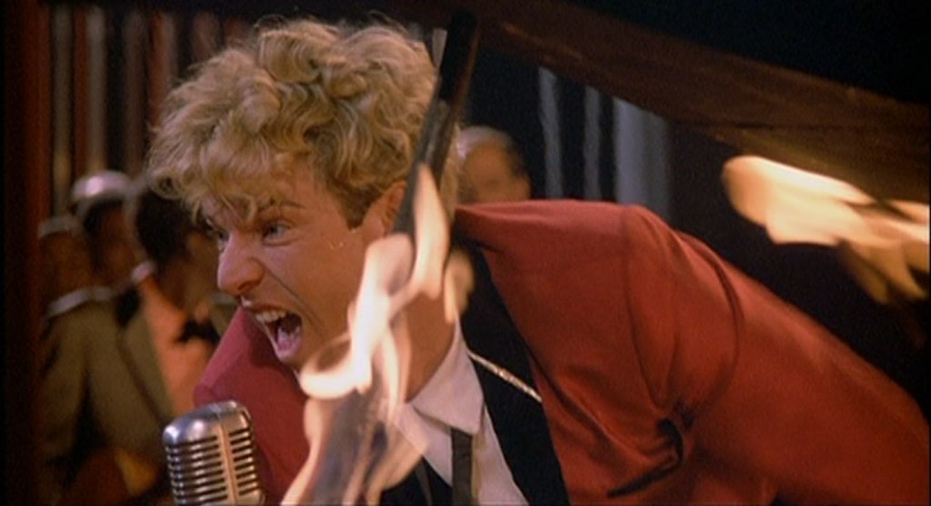 And I’ve so often heard a negative spin put on Dennis Quaid’s performance. As a youth who loved Jerry Lee Lewis and Dennis Quaid, I wouldn’t hear of such criticisms and even told myself I didn’t see what people were talking about. However, taken from a performance angle, Dennis does play it over-the-top. While this may mesh with what I’ve just described as a film that is out for kicks and doesn’t take itself too seriously, it is still obvious and jarring. Quaid employs vigorous head movements, bubble-gum-popping smirks, smouldering eyes and an exaggerated akimbo-armed strut. His bugged-out eyes when he sings, etc. But here’s the way I’ve come to look at it. It was a big ask, portraying Jerry Lee Lewis. This can be said of many larger-than-life figures in entertainment history. Does Quaid overdo it? Yes – but not by much. I think we can assume that Jerry is really like that. It still is hard to watch sometimes but understanding this may make it easier. I’ve found it more difficult, actually, watching Lewis – who praised Quaid’s performance – himself be interviewed. He is a colourful, quirky, eccentric, personality. To have played him any other way would simply have been false.