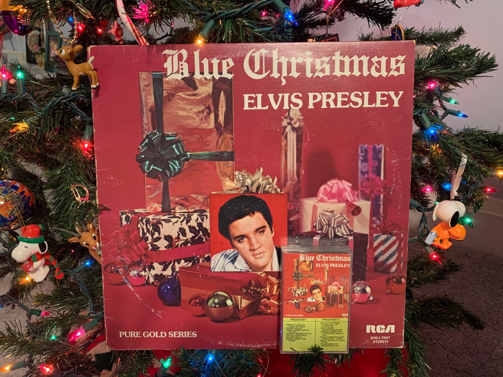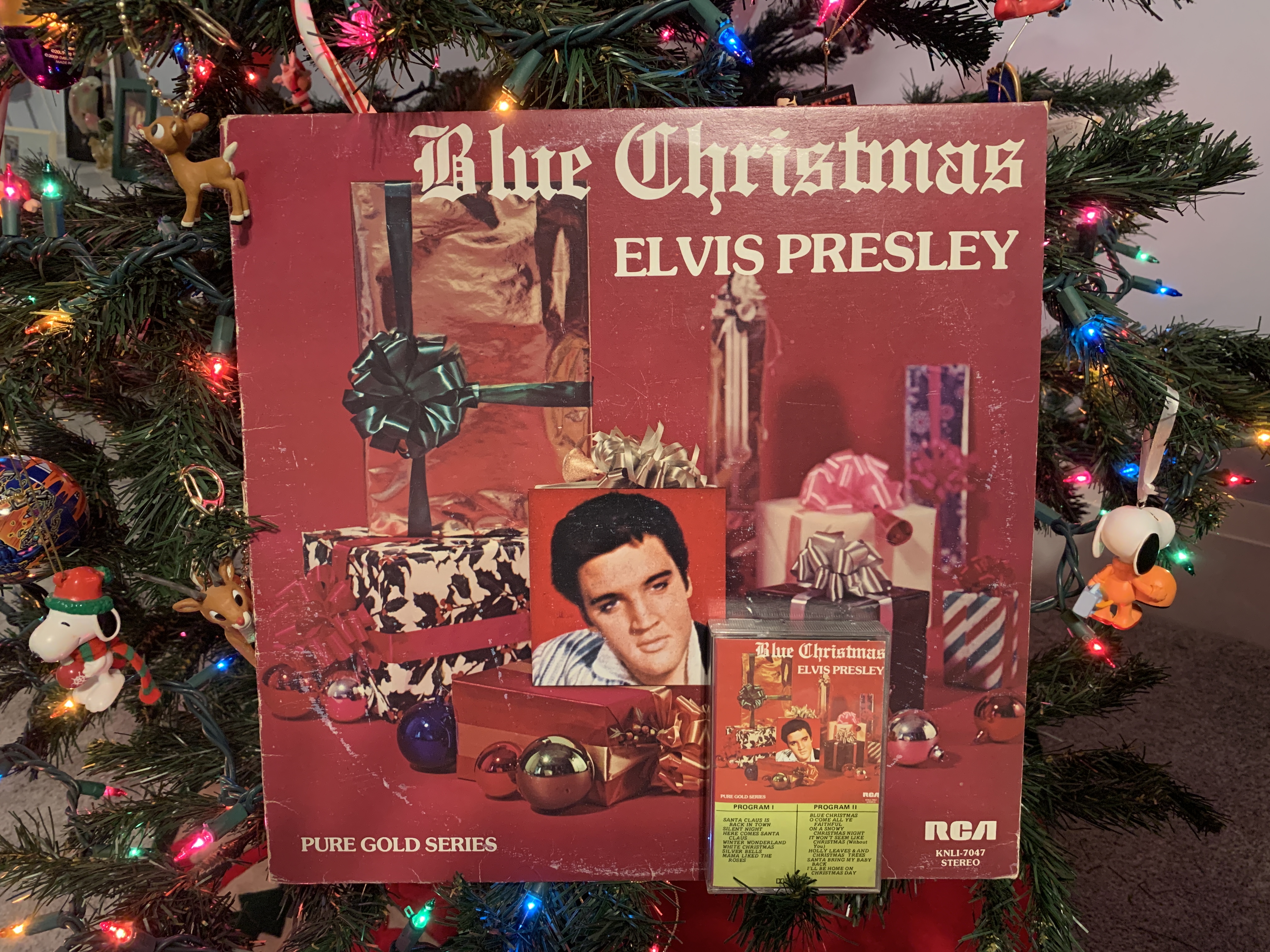 Let’s look at a handful of the many releases that have utilized Elvis’ 20 Christmas songs. In November of 1970, a budget version of Elvis’ Christmas Album was issued on RCA’s Camden label. Gone were the gospel songs and in their place were added the ’66 single “If Every Day Was Like Christmas” and – inexplicably – “Mama Liked the Roses”, a tender song of remembrance recorded at American Sound Studios in Memphis in 1969. Neither song had yet featured on an LP release. This version of the album bore the US cover shown above middle with Elvis wearing his blue Speedway jacket (I have one!). Then in 1976, the RCA Pure Gold imprint released what they called Blue Christmas on vinyl and cassette in Canada. It contained what amounts to the best of the ’57 and the ’71 albums plus “Mama Liked the Roses” but minus “If Every Day Was Like Christmas”, available on earlier editions. This is the version I grew up with.