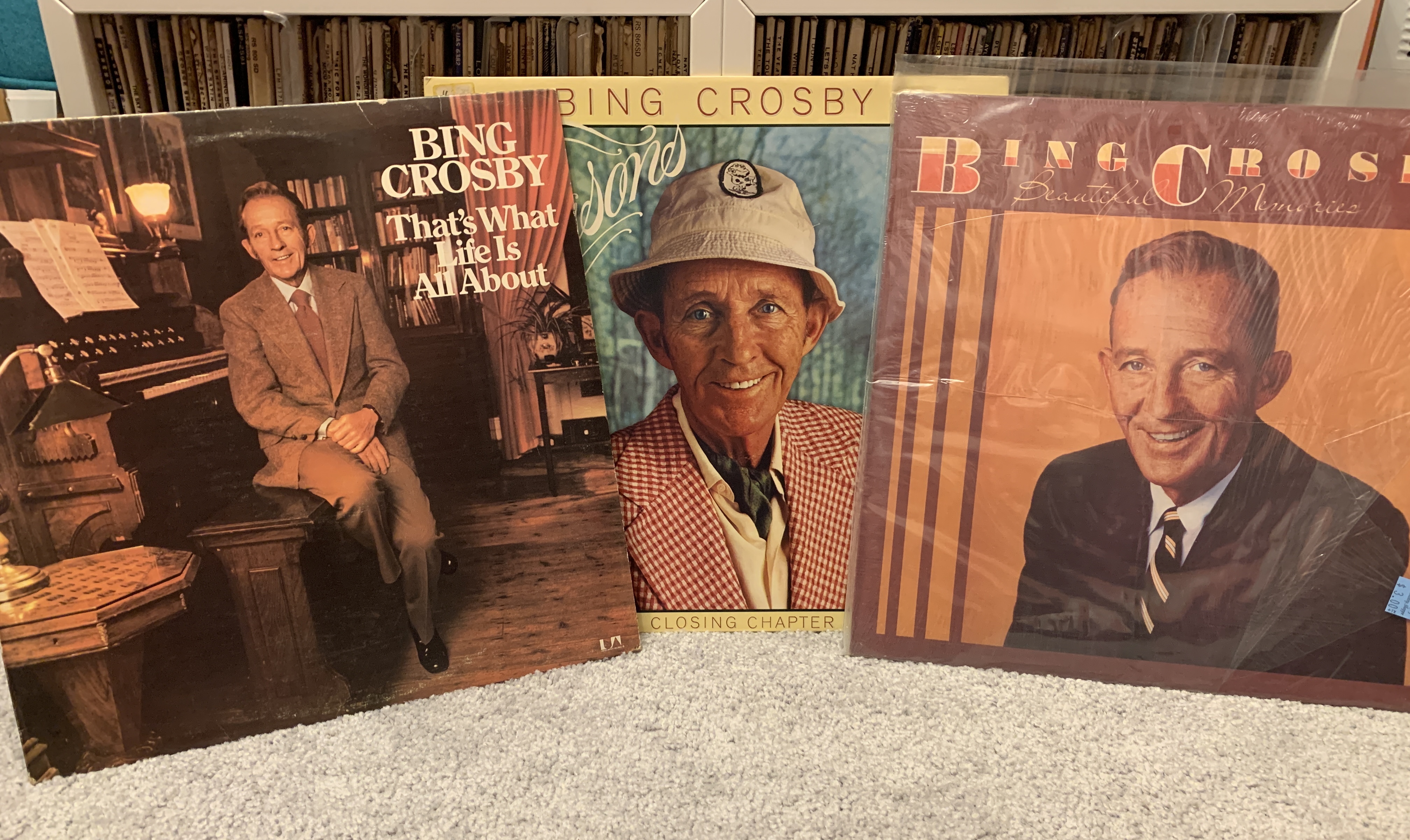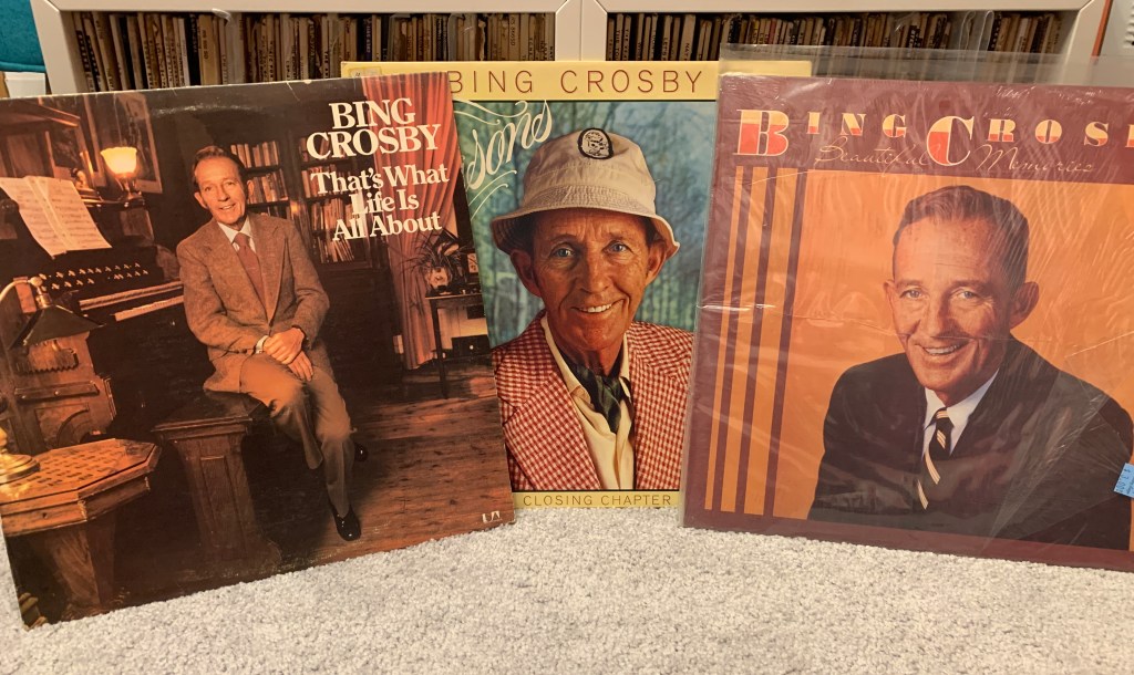 I soon realized that of all the many things that Bing Crosby was he was not an “album artist”. Digging into his discography, I found it is…odd. Through the Fifties and Sixties, Bing released scores of albums but the releases from these years seem haphazard, careless and excessive in number. He recorded soundtracks alone and with various other artists, he released children’s records some spoken word, Christmas records and sing-along records and all of these were released on many different labels. Also what he did was finance recording sessions himself and then lease the results to labels around the world making his recorded output more like a business venture. Sound fiscal events. One may have to accept that maybe going into the studio to record a program of songs with a like-minded arranger was not all that important to Bing Crosby. I may have made the mistake of thinking that everyone made records the way Sinatra did but not even Dean, Sammy or Nat Cole really approached it like Francis did. So, what happened to all the Crosby records sold in the Fifties and Sixties? I’ve sure never seen them in the wild at thrift stores or garage sales. What I do come across regularly though are Crosby’s releases from the 1970’s.