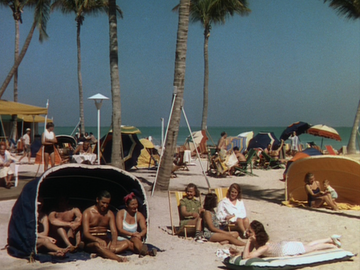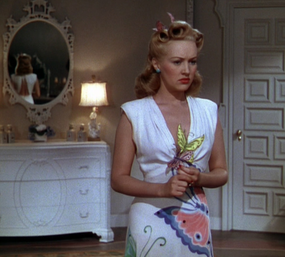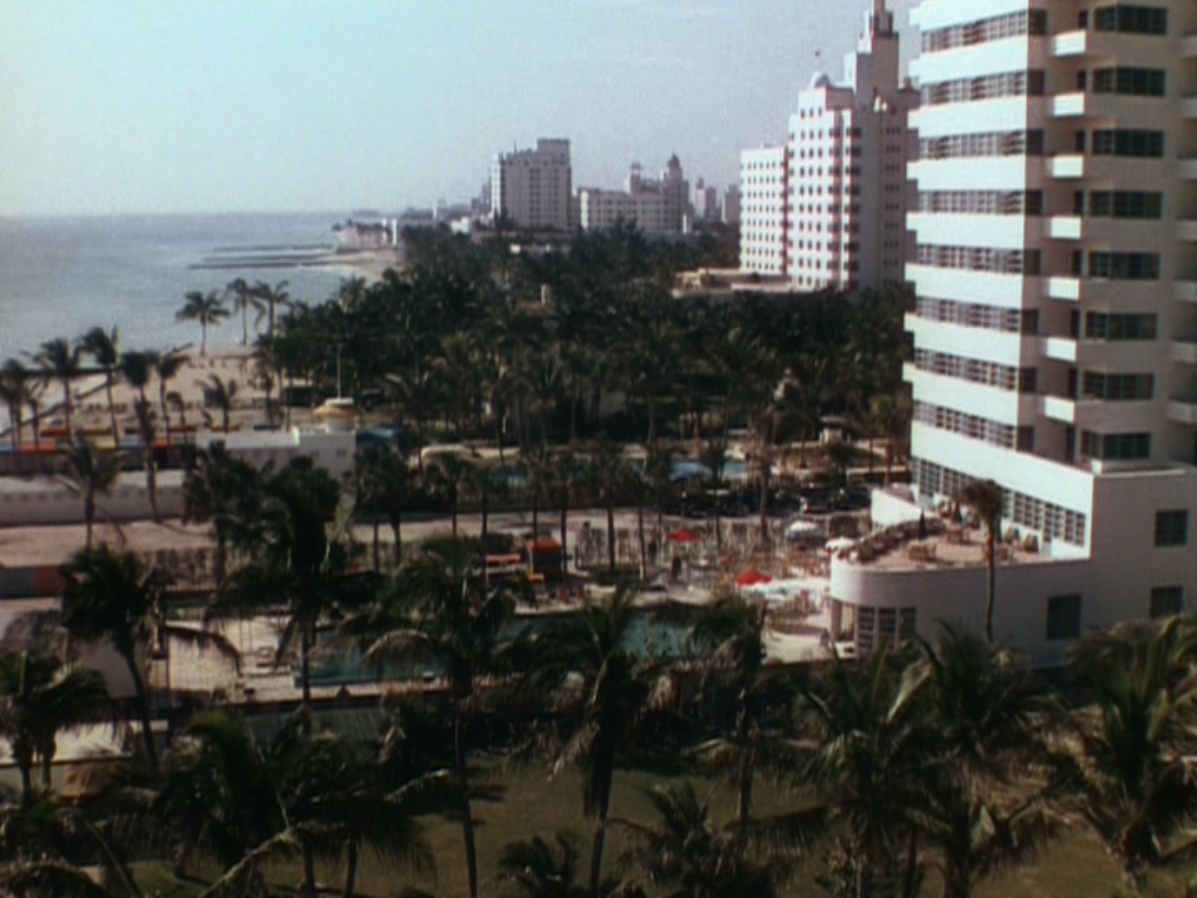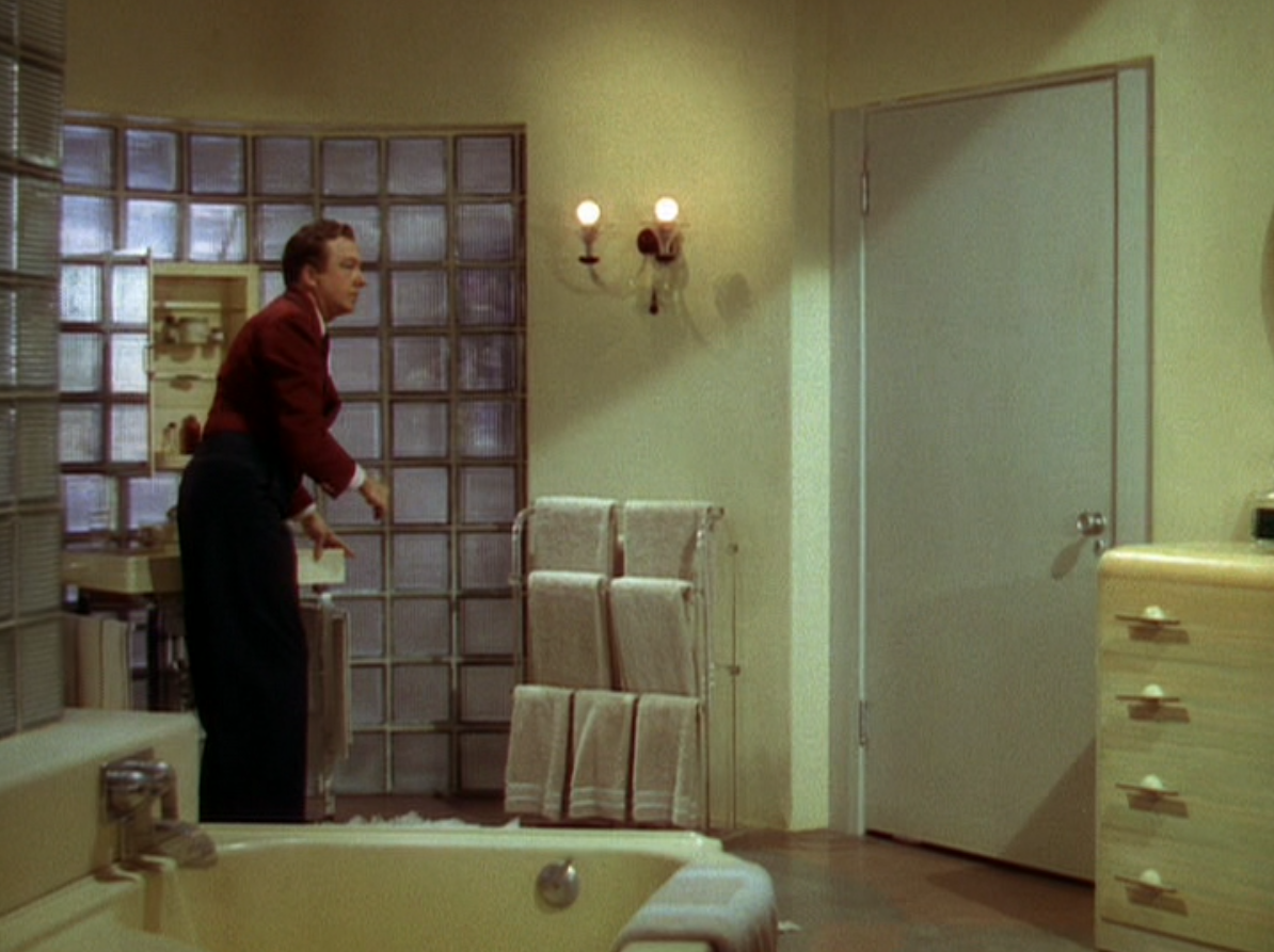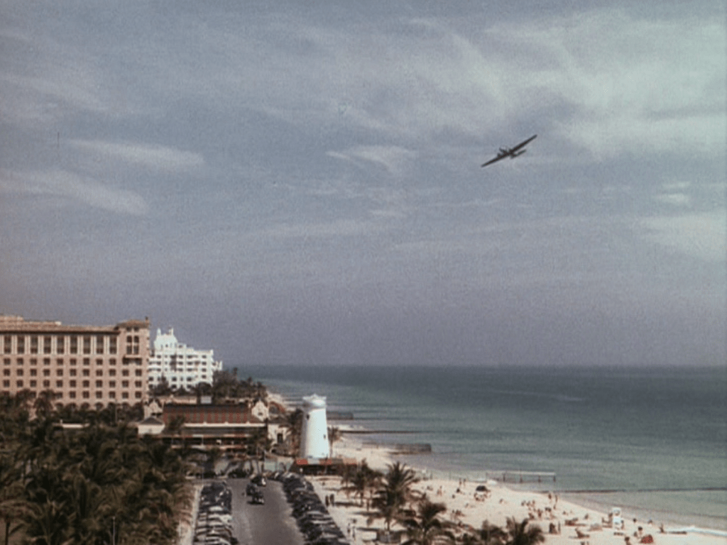 Every stick of furniture in Bungalow C of the Flamingo Hotel, where the Latimer gals are staying is gorgeous. The decor is to die; dig the back of the front door, that big, curved couch, those beds and the glass brick in the bathroom. Imagine sleeping in those beds, your head guarded on each side by those curved arms. The exterior shots of Florida, circa 1941 are equally stunning. Just being able to see – in glorious Technicolor – the Sunshine State at that time is wonderful; the beach, the buildings and a few nice cars thrown in.