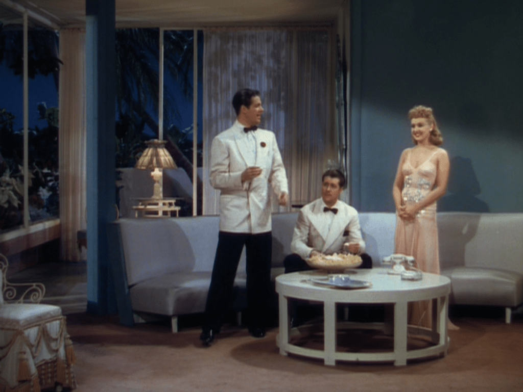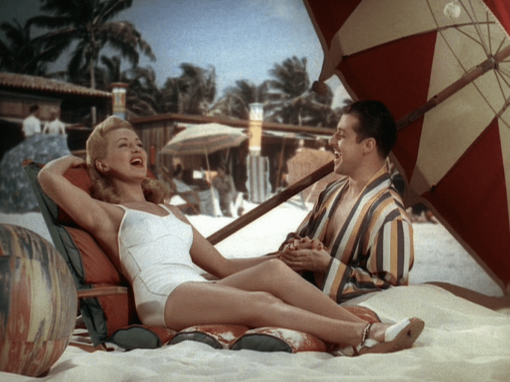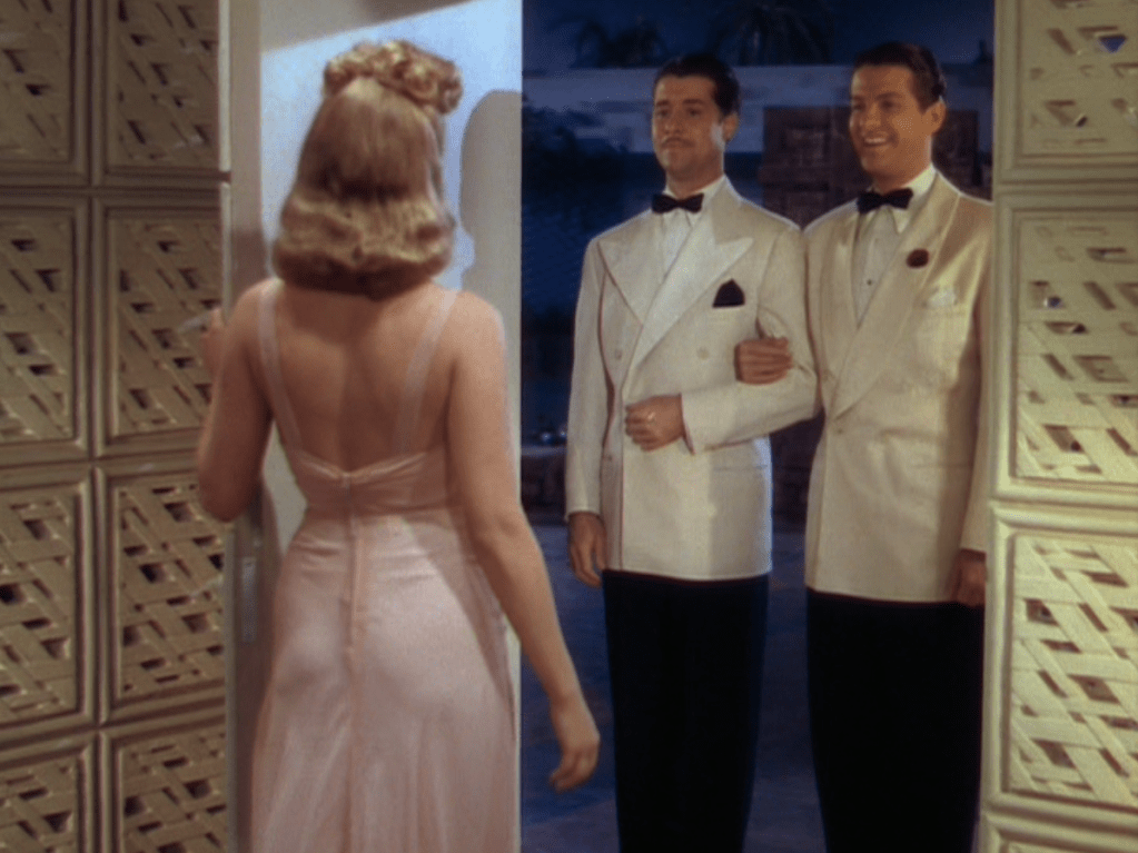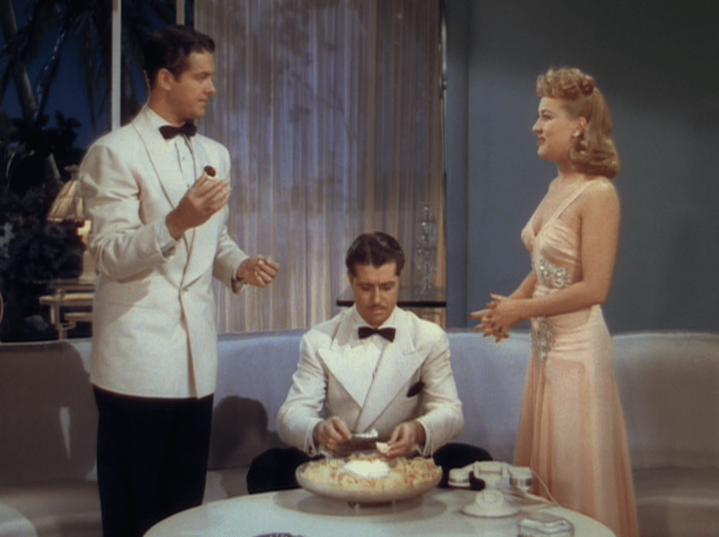 As for the comedy, there are some genuinely hilarious moments in Moon Over Miami. The majority of them come courtesy of Don Ameche. Now, in no way is Don Ameche my favourite actor – even of the era – but his performance as Phil is one of my favourite of all-time. He’s a playboy who’s genuine and honest and seems down-to-earth. All he wants is a good time and who can fault him? Cummings is great as his bud – it gives you the impression that Ameche and he may have been friends in the real world. For starters, I love how Phil asks Jack straight out “what’s the idea with all this thumb stroke?” when he sees Jack giving Kay the yay or nay on the people she’s meeting.