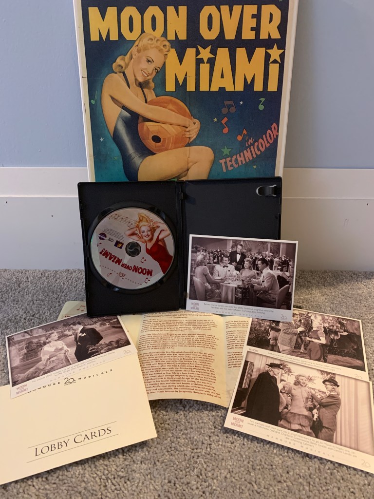 Many, many moons ago I decided to tape off TV all the classic films I could and one of them was this beauty from Fox in 1941. And it was many more moons until I finally bought it on DVD. On one of the trips my wife and I took for our anniversary back to my hometown and the hotel in which we got engaged, I went down to my old favourite record store, Encore Records, and there I found Moon Over Miami in a nice edition that featured a stack of lobby cards.
