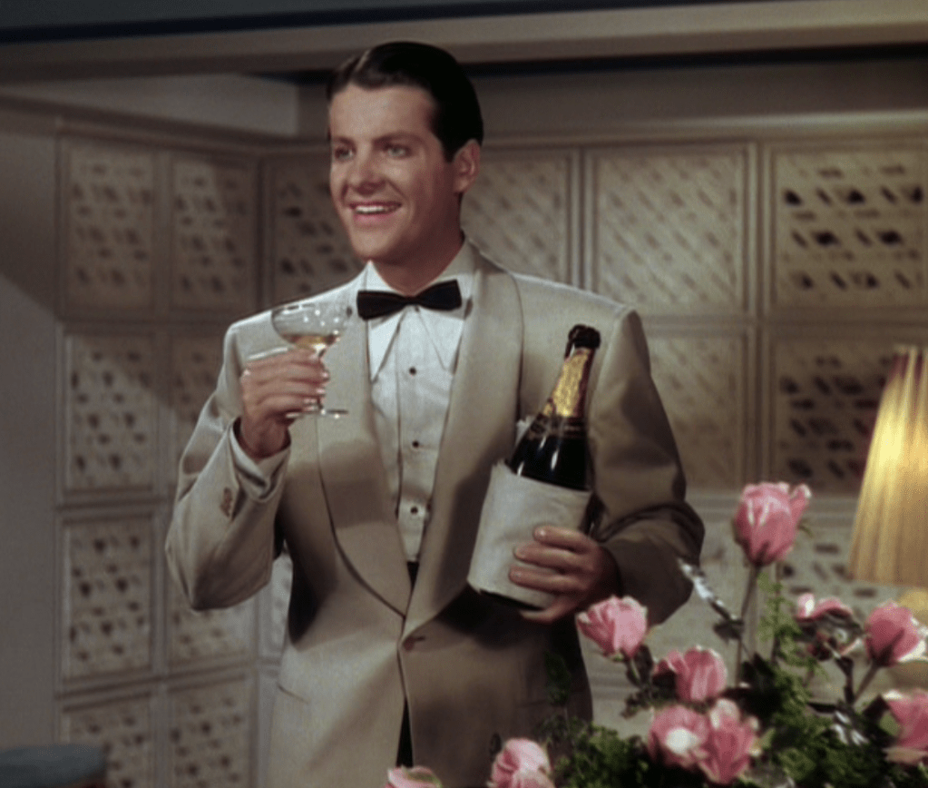Script-wise, the film does well juxtaposing “just folks” with “society”. The girls come from a Texas hamburger stand and they understand and can appreciate good, old fashioned fixin’s like “gashouse eggs” and can plainly see that many of these young people are a shiftless bunch of drips. Barbara is right to call Jeff on his own drifting and living off money that his father worked hard to make. Jeff makes the decision to roll up his sleeves but Phil is compelled to go to work. But – after willingly admitting his poverty to Kay – he is ready to take a job; although it’s not exactly factory work. Selling refrigerators in Brazil does have an adventurous ring to it. This is all to say that the two rich playboys are still pretty close to regular joes who seem ready to earn their own way.