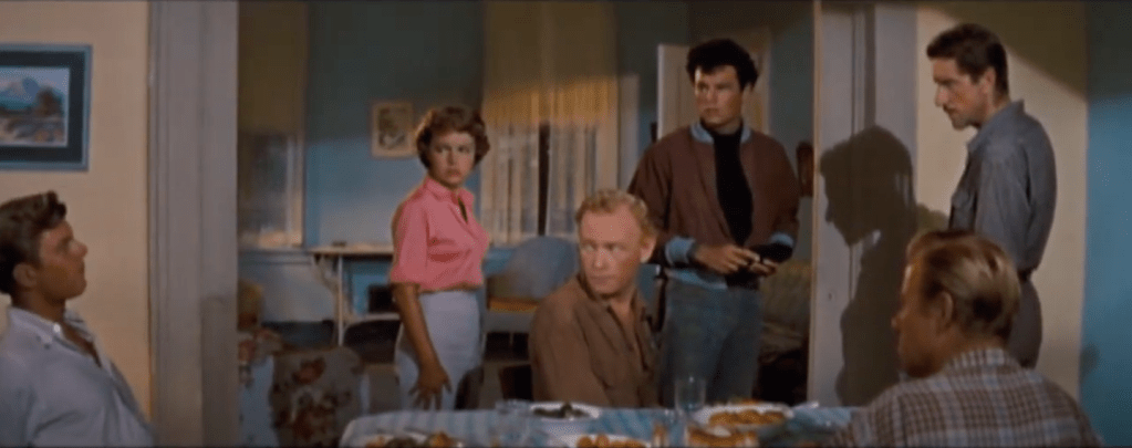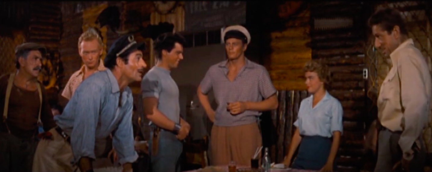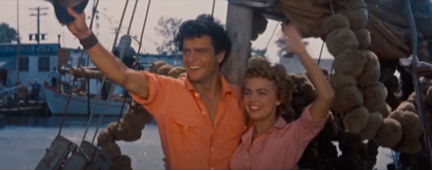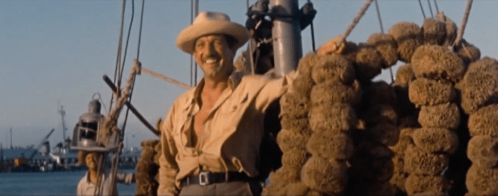At the close of another fruitless trip, the Greeks come back to shore where all the spongers sell their wares. Not having many sponges to sell, all the Greeks face when they return to the dock is their creditors. Mike begins to formulate a plan to reverse their fortunes – the family will cross a boundary of sorts and dive for sponges in the Glades. This area, though, is the domain of the Conchs. The prominent family in this neck of the woods is the Rhys family lead by Thomas Rhys (Boone) and his sons including, Griff (Carey, Jr.) and daughter, Gwyneth (Moore) who is being actively courted by another member of the crew, Arnold (Graves).