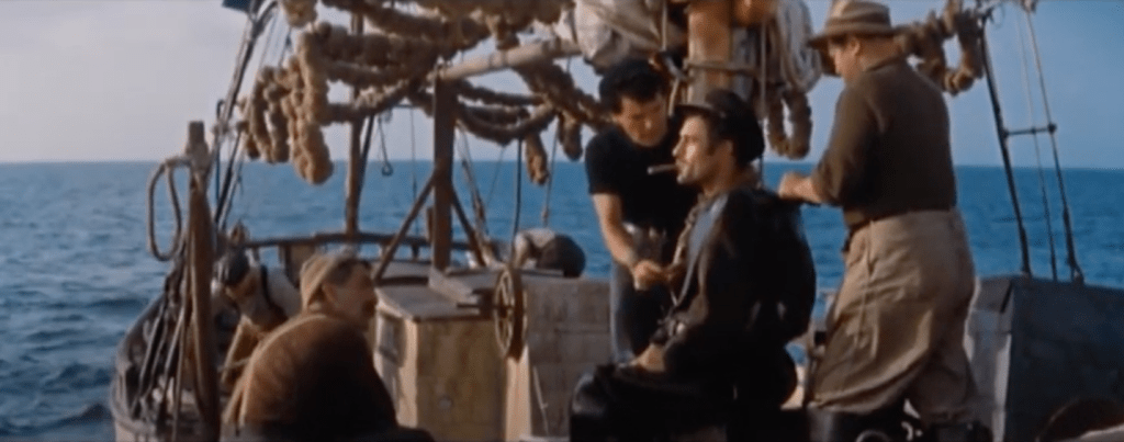 One can also enjoy the development of Tony and Gwyneth’s relationship; Moore particularly is fun to watch as she is so vivacious. Graves as Arnold is appropriately menacing and the cause of much of the trouble. I can appreciate Boone’s character’s condolences when Tony’s pop dies and his disapproval of Arnold’s theft of the Greek’s sponges; it shows there is respect between the two older men. The plot also does well in depicting the women left behind on shore while the men go out for long periods of time cheating death on the ocean floor.