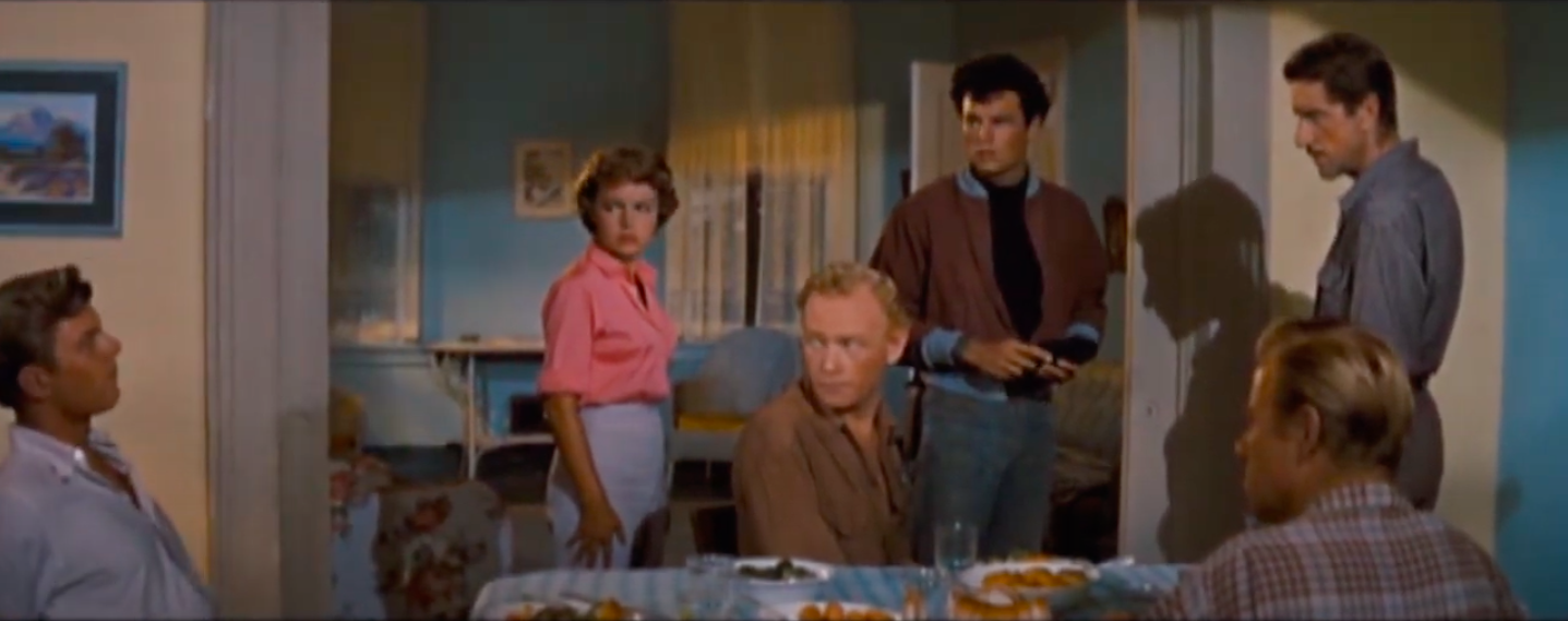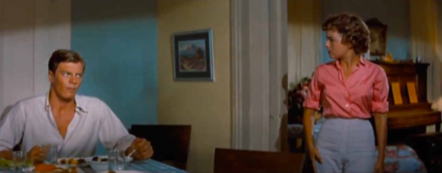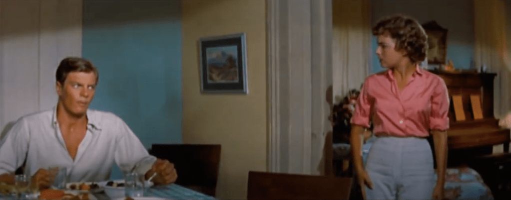 Robert John Wagner is, as of this writing, one of the last remaining stars of the golden era. I have talked about RJ a few times before in these pages. Beneath the 12-Mile Reef was his first lead role and while a black-haired, curly-mopped Greek he ain’t, he does well. Terry Moore I have also talked about here. She, like Wagner, is still with us, as of this writing. Terry is 24 years old here and was just coming into her own, having garnered an Oscar nomination for her previous role in Come Back, Little Sheba the year before.