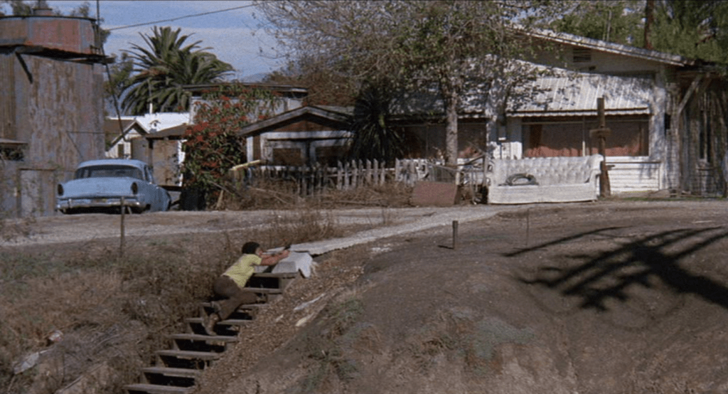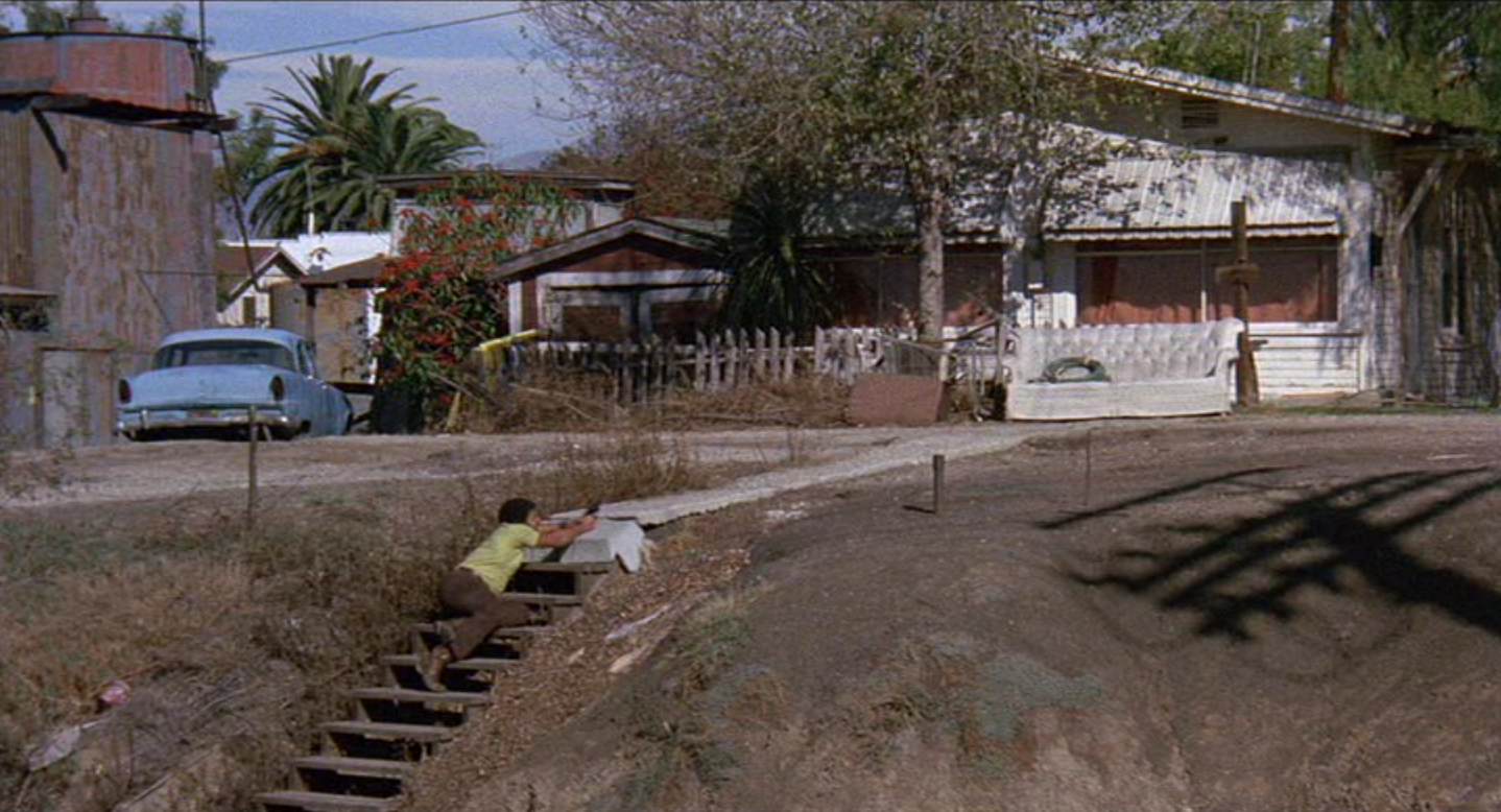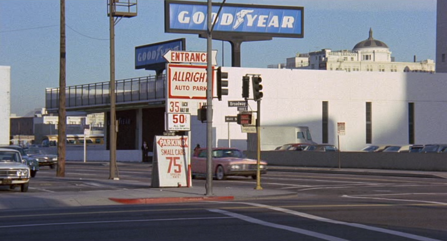 Truck’s apartment is in the Brownleigh Apartments at 626 St. Paul Avenue, Dorinda has some maintenance done at a salon on Ventura in Encino and poor Annie is a frequent guest at the Lincoln Heights Jail. Truck picks her up there twice in his convertible; neither time is she very happy with him. Truck and Annie stroll through Pershing Square. The scene features extras who aren’t; you see real citizens unaware that a film is being shot.