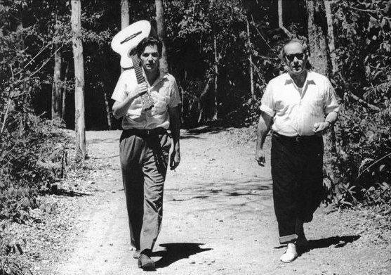 Jobim walking with Vinicius de Moraes near Brasilia on the city’s inauguration day, April 21, 1960. This photo was the model for the Jobim statue; see below.