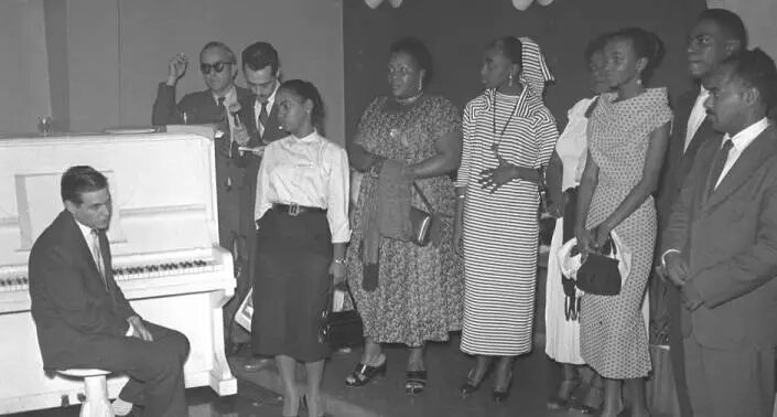 Jobim and Vinicius de Moraes with the cast of Orfeu da Conceição.