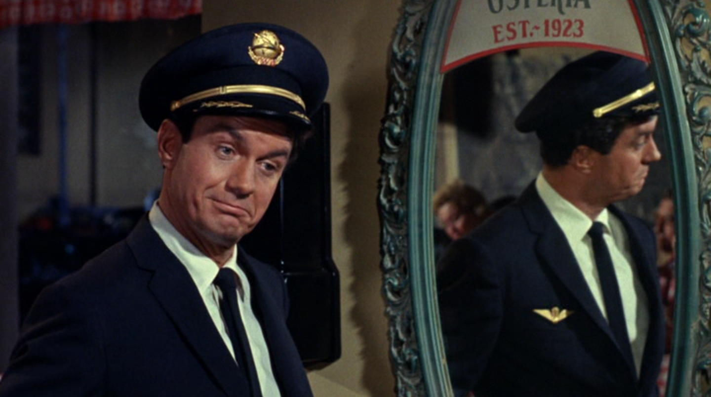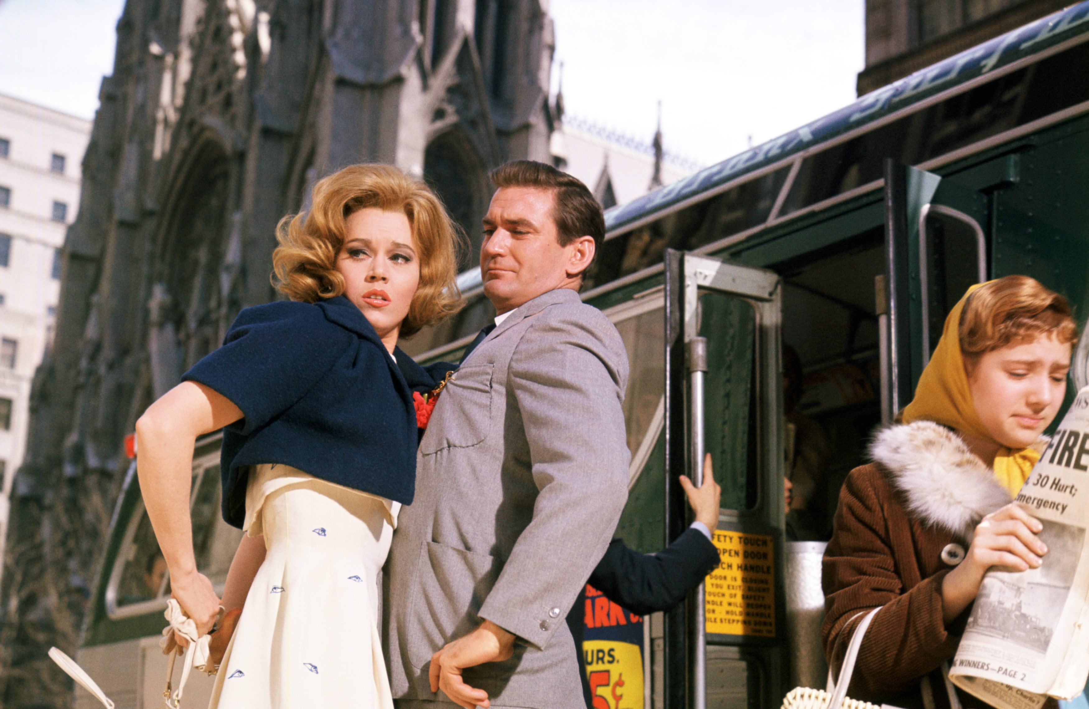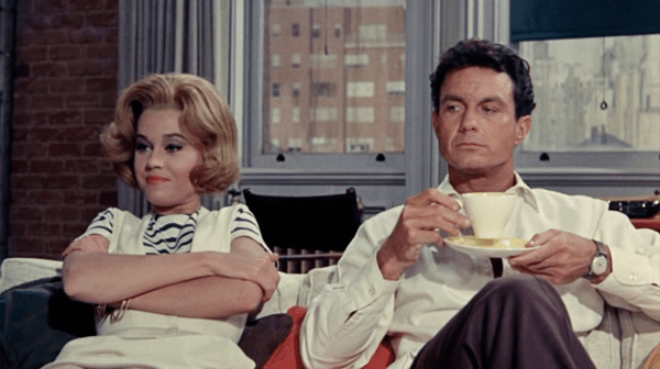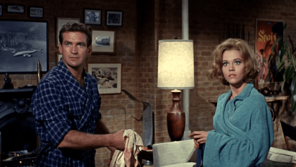 Adam Tyler (Robertson) is a pilot for TWA. He flies home to Idlewild in New York, excited that he has a whole Sunday off to spend with his girl, Mona (Morrow). As he cleans up his gorgeous penthouse apartment, 4B at 120 E. 65th St., there’s a knock at the door. He opens it expecting to see Mona but there’s another girl at the door, his sister, Eileen (Fonda). Poor Eileen has been cast aside by her fiancée, wealthy Russ Wilson (Culp) and has escaped the family home in Albany for a week’s respite with her brother in Manhattan. Adam sees his intimate afternoon with Mona go up in smoke but he plays it cool and listens to his sister’s story.