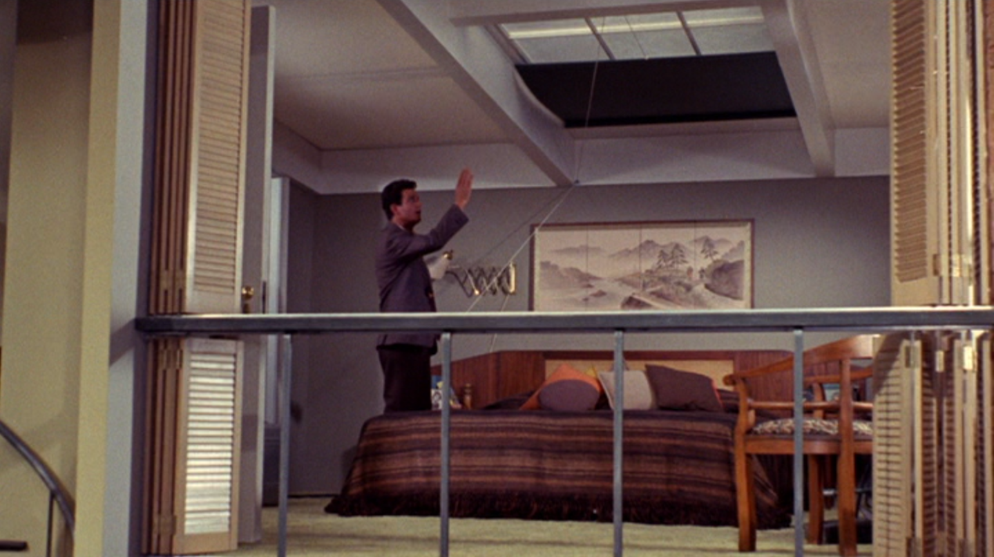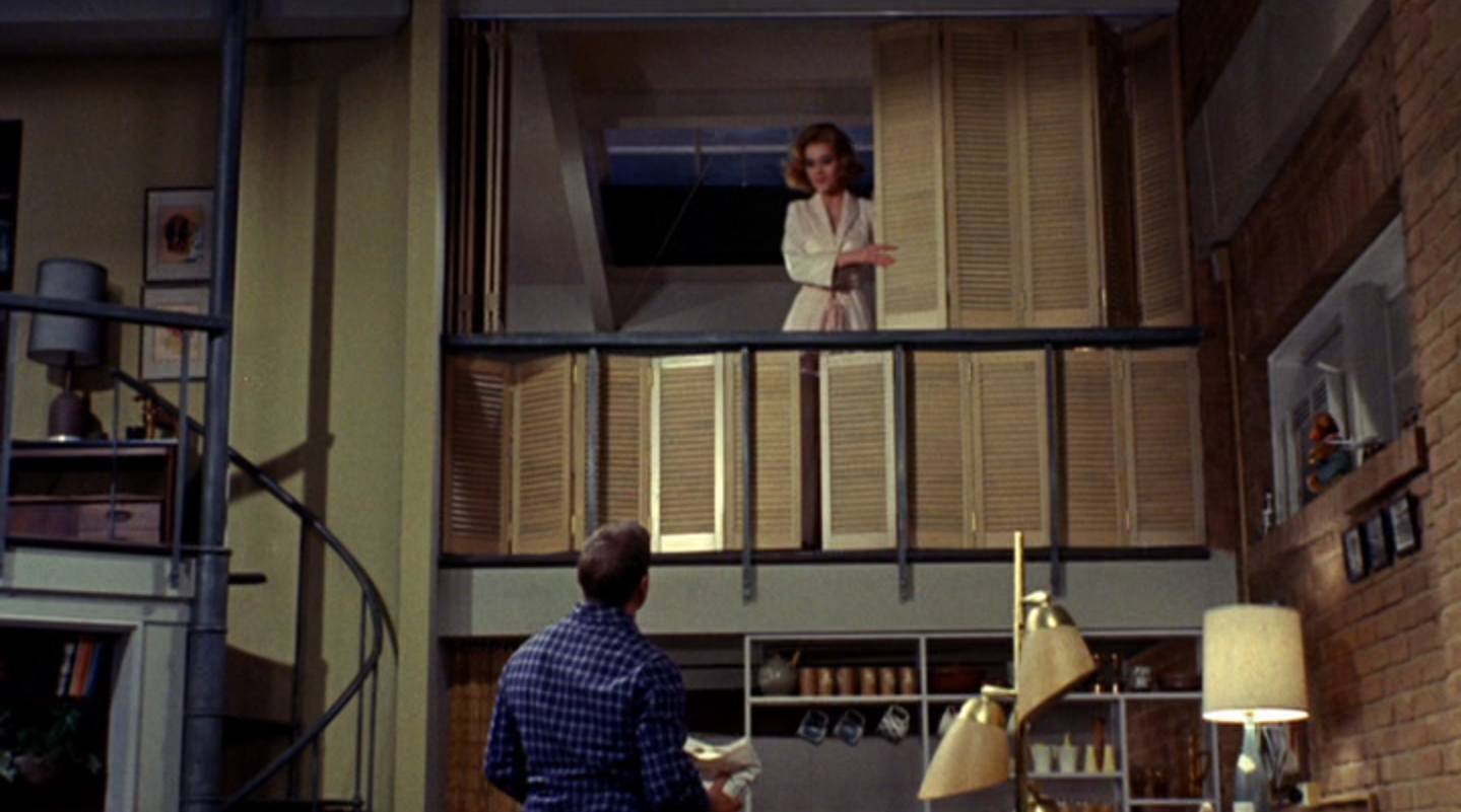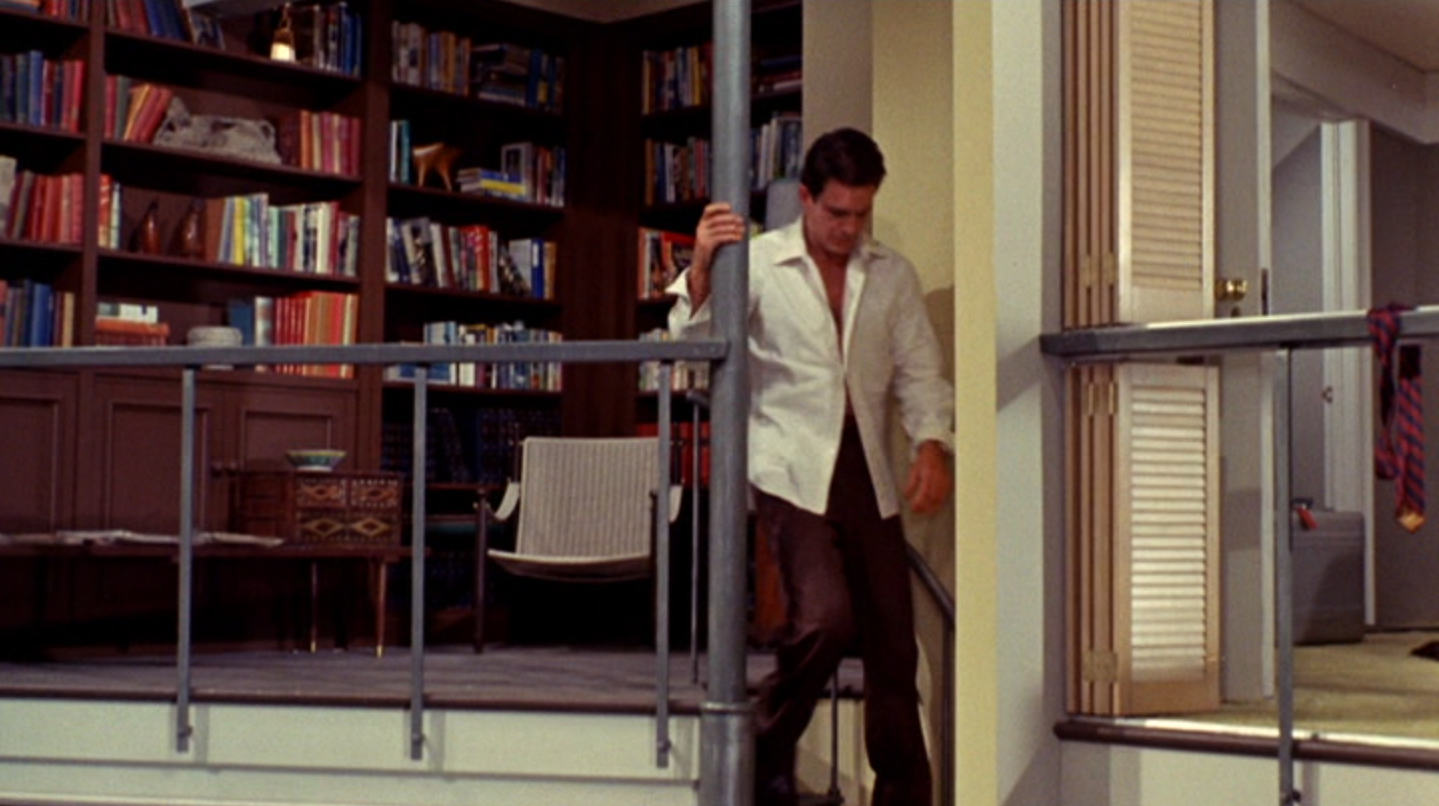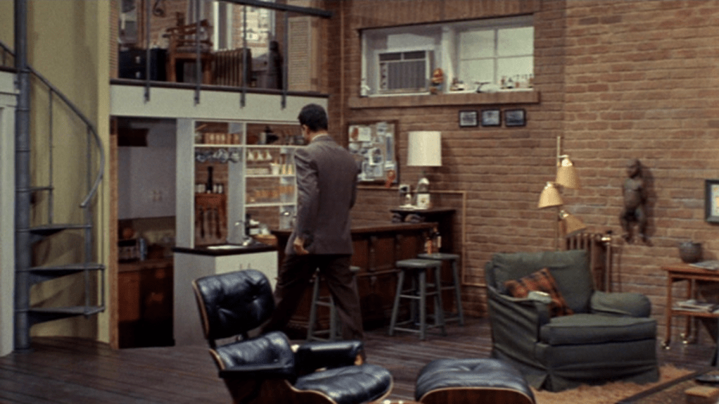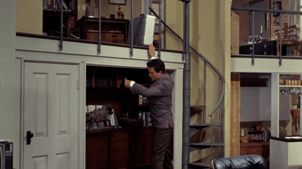 The real star of Sunday in New York is Adam’s apartment. His penthouse digs are nothing less than the most perfect living space I’ve ever seen depicted on film. The large, two-storey apartment boasts high ceilings and a loft featuring library/sitting room and bedroom. The main living room is luxurious and includes a fireplace. You step down to a quaint bar and kitchen area. Up the spiral staircase and you find a comfortable sitting area with a chair surrounded by bookshelves. Through a door to the bedroom complete with skylight above the bed. Shutters close along the bedroom’s railing for privacy. It is simply divine and I’ve spent many hours just imagining living there, preparing a meal in the galley, reading in the library… Director Tewksbury knows what he’s got and this is borne out by the many places he set up his shots. He places his camera all over the apartment set affording the viewer unlimited visual access to each area of the pad, even giving different views of the same spot so the viewer can fully appreciate its grandeur. The same set was used in the woefully substandard film Honeymoon Hotel (1964) starring Robert Goulet. As I’ve scoured the internet for articles with good representations of this miracle of set design I’ve been disappointed. I hope to present here at Your Home for Vintage Leisure the definitive tour of the apartment from Sunday in New York.