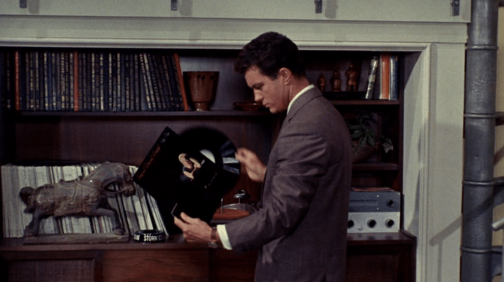 Peter Nero provides his only film score and also appears in the movie. Nero (b. 1934), as most of us old school types know, is a stalwart pianist and recording artist of the easy listening variety. I have a few of his albums in my collection, as any self-respecting collector has. They include the soundtrack and one of two seen in the film; I have Young and Warm and Wonderful (1961) that Adam has in his collection. The other was new at the time; Eileen gifts her brother The Colorful Nero. I also have maybe his finest, Summer of ’42, from 1972. Nero’s score for our film is fine and features Mel Tormé singing the title track, a tune I know better from Bobby Darin’s excellent treatment. Dig the cat who sings the film’s other song, the delightful “Hello”, at the Club Nero. Looks like a car salesman. IMDb claims its Harry Babbitt, who sang with Kay Kyser, but I don’t think that’s right. I can’t find any skinny on who this guy is so the mystery persists. Any help would be appreciated.