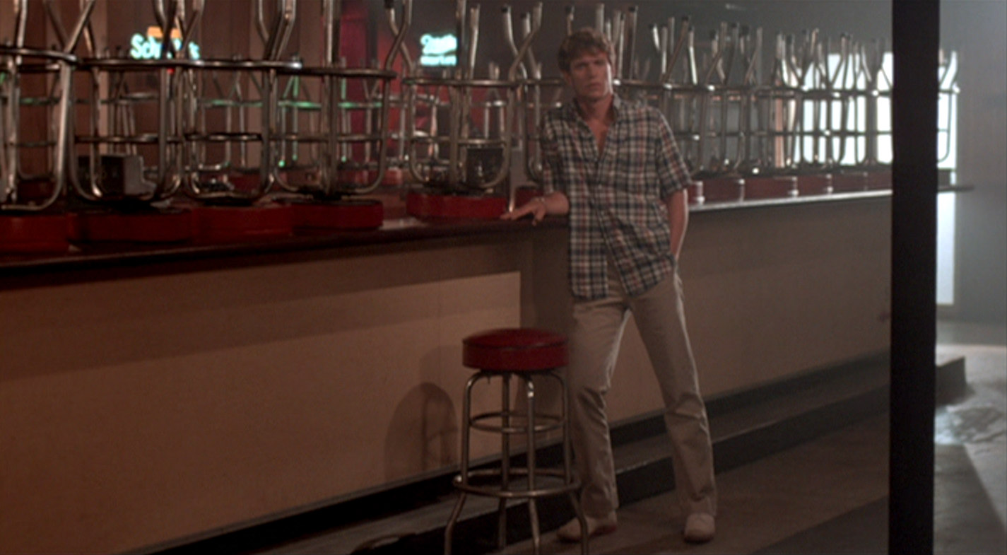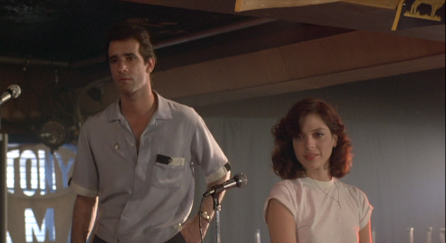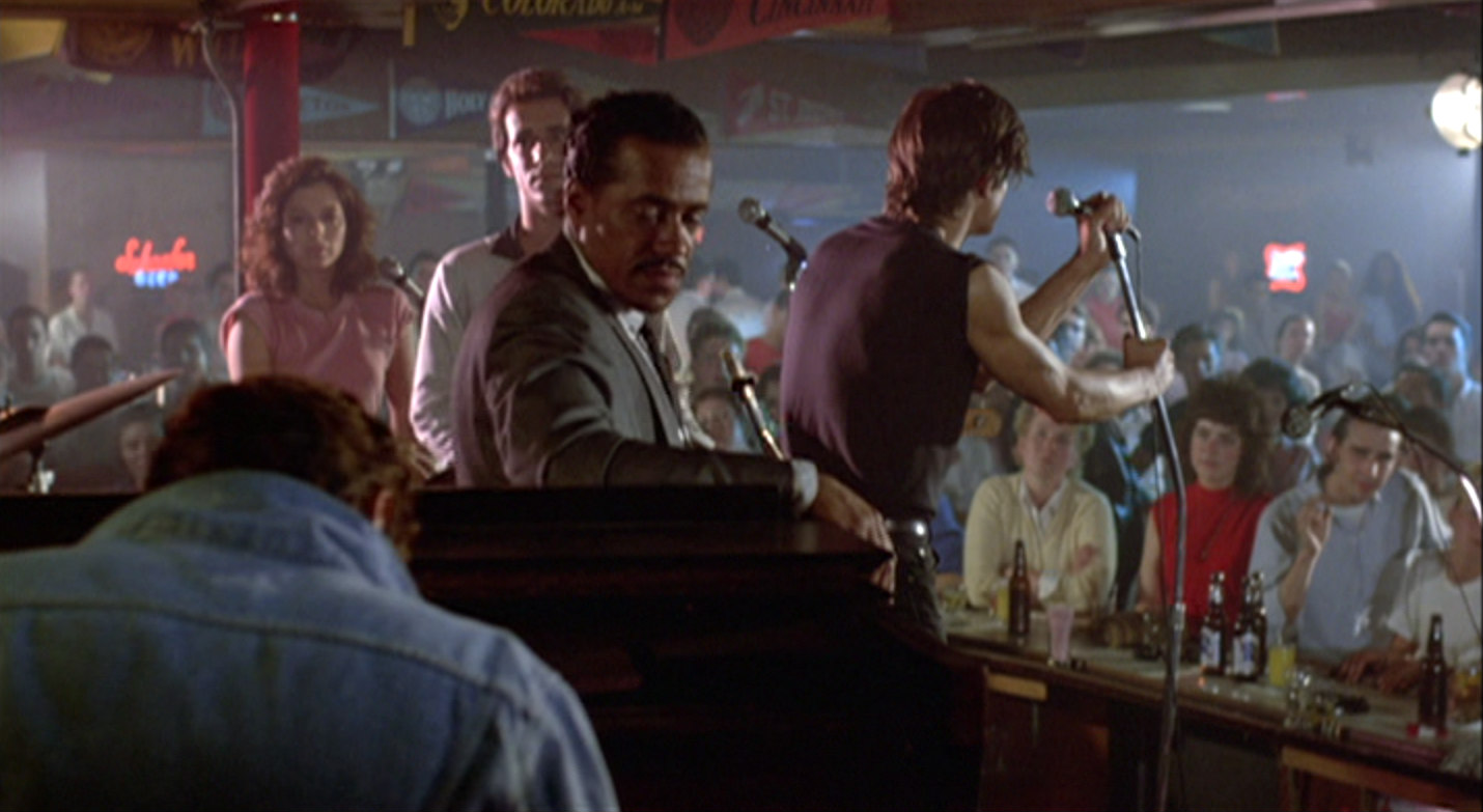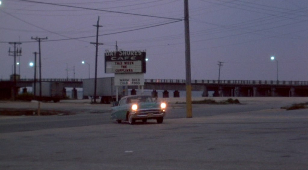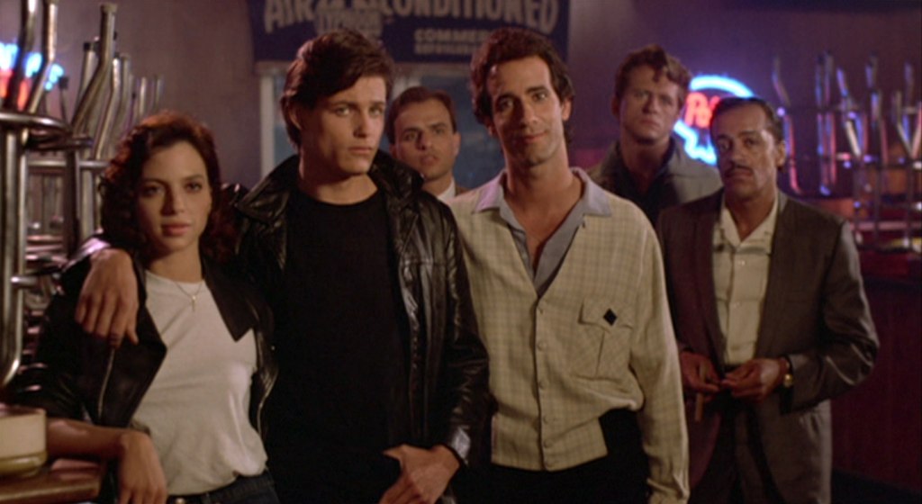 Frank Ridgeway (Berenger) teaches English Lit at a high school in Vineland. On the way to work one morning, he hears “Wild Summer Nights”, a song by Eddie and the Cruisers that takes him back to his time spent as “The Wordman”, lyricist and keyboardist for the band. After class lets out for the weekend, Frank reclines at his desk and reminisces about the summer of 1962 when he worked at Tony Mart’s in Somer’s Point. He recalls the time the Cruisers played an engagement there, a time when he met the group and impressed them with his ability to turn a phrase. Frank is pulled out of his memories of joining the band by Maggie Foley who introduces herself and asks Frank for an interview. Frank demurs and heads home.