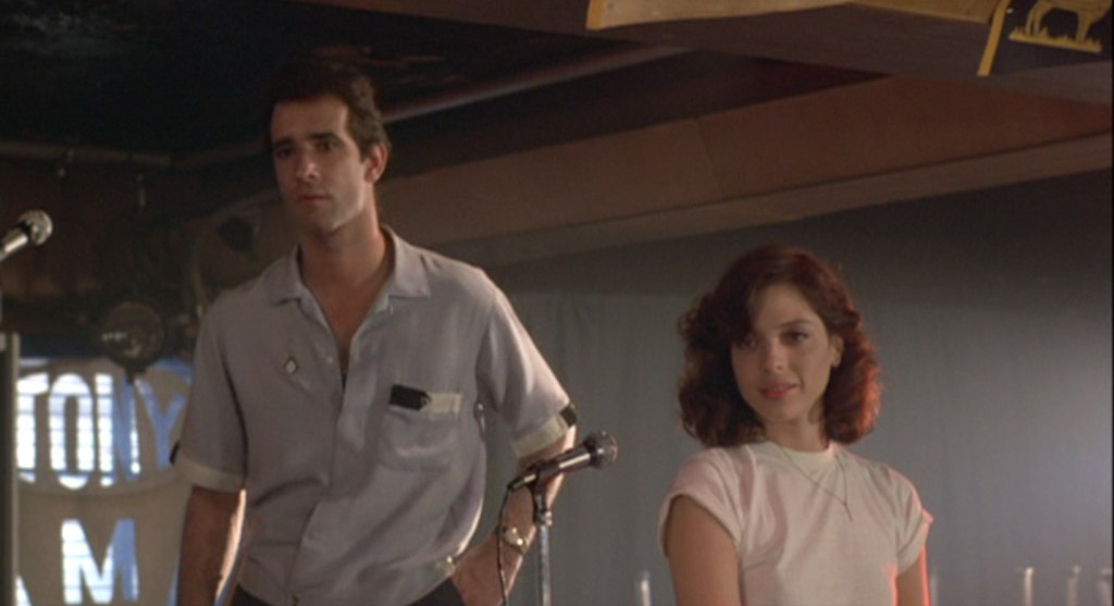 Arriving at his trailer, Frank is shocked to see that his home has been ransacked. As he assesses the damage, his phone rings. It is old Doc Robbins (Pantoliano), the manager of the Cruisers. Doc asks Frank to come and see him at WRHE, the Asbury Park radio station where he works. Doc tells Frank that the Cruisers are becoming news again and that may mean a windfall for the surviving members. Driving Doc home, Frank is told about their old bandmate Sal Amato (Laurence) who has assembled an Eddie and the Cruisers tribute show that plays the hotel lounges in the area. Maybe we can put the original band back together, Doc says but Wordman isn’t having it. When Doc shows Frank the motel room he calls home, Franks sees that Doc has had a break-in, too. Doc tells Frank that music lovers must be in search of the lost tapes of the band’s second album.