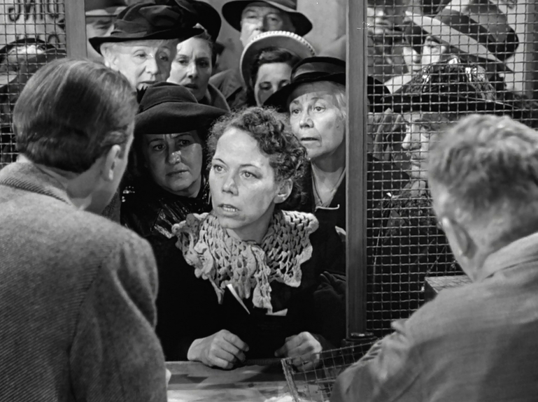 Ms. Davis (Ellen Corby) only needs $17.50. This doesn’t sound like much of a scene but I choke up each time. Potter threatens to shut down the Building and Loan and George’s customers are in a panic. They all show up wanting to withdraw all their money and to close their accounts. George tries to convince each one to take out only what each needs and to keep their accounts open until they can weather this storm. Not having everyone’s full deposit amounts on hand, Mary comes up with the idea to use the wad of cash the newlyweds have for their now-to-be-aborted honeymoon. The first ingrate that comes to the window wants all his cash, thank you very much. George wonders if the money will hold out. Next up is Ms. Davis.