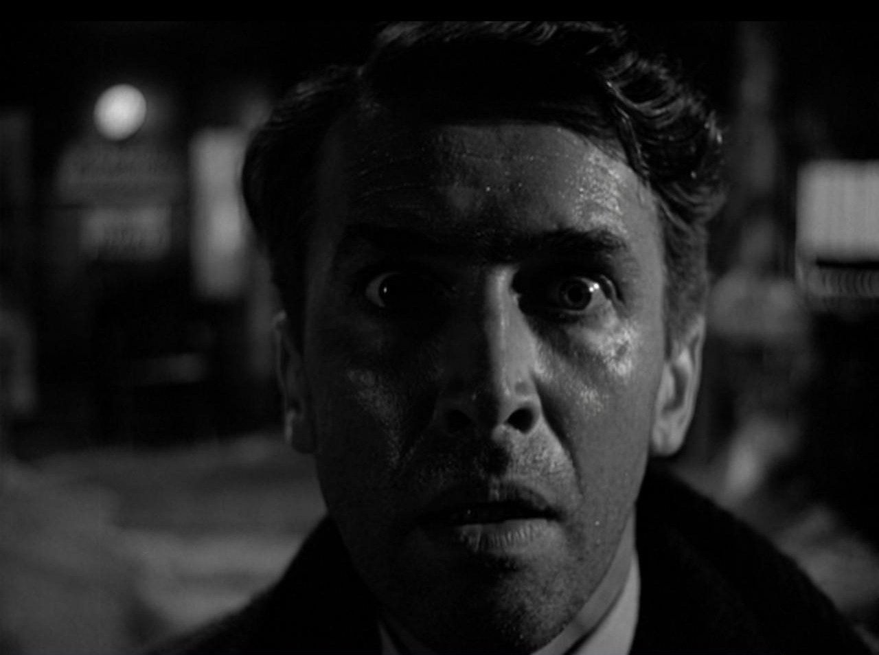 George is horrified by the stunning fact that his mother doesn’t know him. He flees the door, running but then stops dead. The close-up Capra achieves with his cinematographers (apparently there were three) emphasizes the horror in George’s face. This is the moment he realizes that what Clarence has been telling him might be true. And if it is, what does that mean? It means he has been erased from existence and he has lost “the greatest gift” – his life. Again, it is make-up plus acting. As if that tortured, horrified face belongs to the genial James Stewart. The close-up, lasting only a few seconds, may be one of the most harrowing shots in the history of classic film.