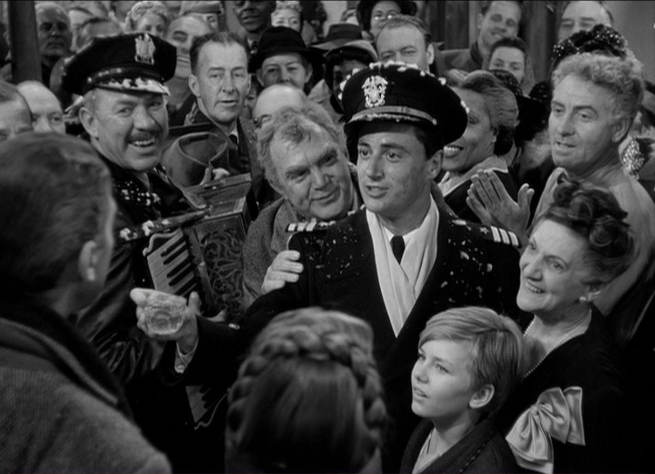 George makes note of people like Mr. Gower, whom he saw in the wicked light of Pottersville, and who are now restored, as he is. Ernie Bishop (Faylen) reads a telegram. Funny but through all of this there may have been the thought that George has a wealthy close friend who could have fixed things in an instant. He was unable to reach Sam Wainwright in Europe but word has got through to him. His reply in the telegram is that he is ready to give George more than enough money to pay his debts. It’s at this moment that the Bailey financial troubles are over. As George lowers his head, the viewer feels an immense weight being lifted. “And there it is”, I often say when I watch this scene. But his brother, Harry. Harry – alive again because George Bailey exists – puts a capper on the evening with his toast. George has felt hampered, trapped and poverty-stricken. He has felt robbed and he has felt that the chains of Bedford Falls have kept him from fulfilling his destiny and from seeing and doing the things he wants. But Harry declares that – not only has George been restored to life – he is wealthy; wealthy in the things that matter. He’s the richest man in town. This town. His town. Bedford Falls.