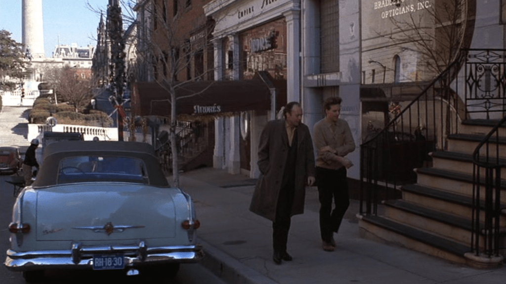 Filming took place for six weeks in March and April of 1981 in and around Baltimore. In “garden suburb” Roland Park, Fenwick takes to hanging out at the Nativity scene set up at the Roland Park Presbyterian Church on Roland Avenue. The distinctive building across the street is the world’s first shopping mall, the Roland Park Shopping Center built in 1895.