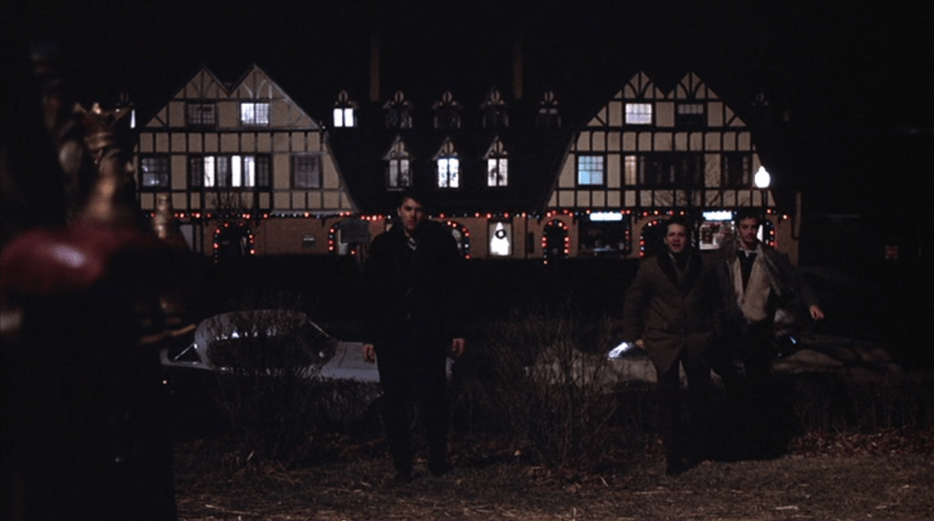 All of this seems beneath Billy and instead he goes to talk to his girl, Barbara (Dowling), who seems to be blowing him off but then confesses she’s pregnant. Boogie loses his $2000 basketball bet and realizes he is in deep trouble. Shrevie agrees to loan Boogie some money but by the time Boogie gets to his place, he and Beth have had a fight and Shrevie has driven off. Boogie tries to console Beth on the front stoop. Fenwick’s brother won’t lend him money to help Boogie and this seems to send the always-brooding Fenwick over the edge; he gets drunk, strips down to his shorts and takes a position in the manger in the Nativity scene at the local church. Billy, Eddie and Shrevie attempt to coax him out but he goes bonkers and wrecks the stable and punches out the wise men. The cops come and the boys spend some time in the slammer. Later at the diner, Eddie confesses to Boogie that he is a virgin and his impending nuptials have him extremely concerned.