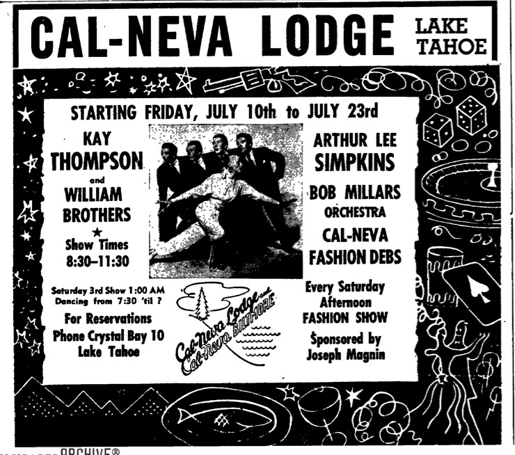 The act was unique and pioneered many staging techniques that became commonplace in clubs. And it was an immediate hit. Kay humbly declared they were “the greatest group that ever hit humanity”. When Kay and the boys opened at Ciro’s in West Hollywood, the elite of Hollywood was in attendance and the performance was a smash. Thompson and Alton had crafted a singular act joining urbane wit with manic athletics. “It wasn’t an act”, said one patron, “it was a scrimmage”. The inspired and cutting-edge material was devoured by standing-room-only crowds and the act was uniformly hailed as brilliant. Kay Thompson and the Williams Brothers were the talk of the town.