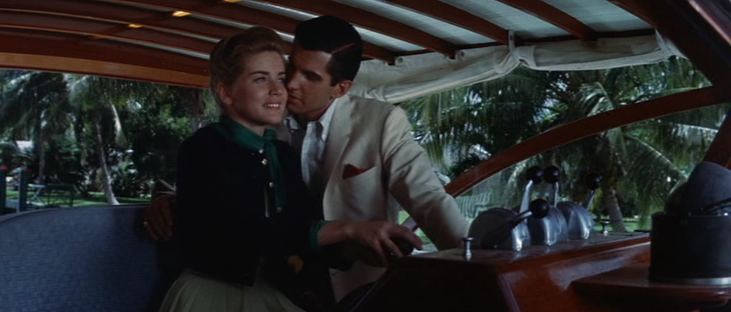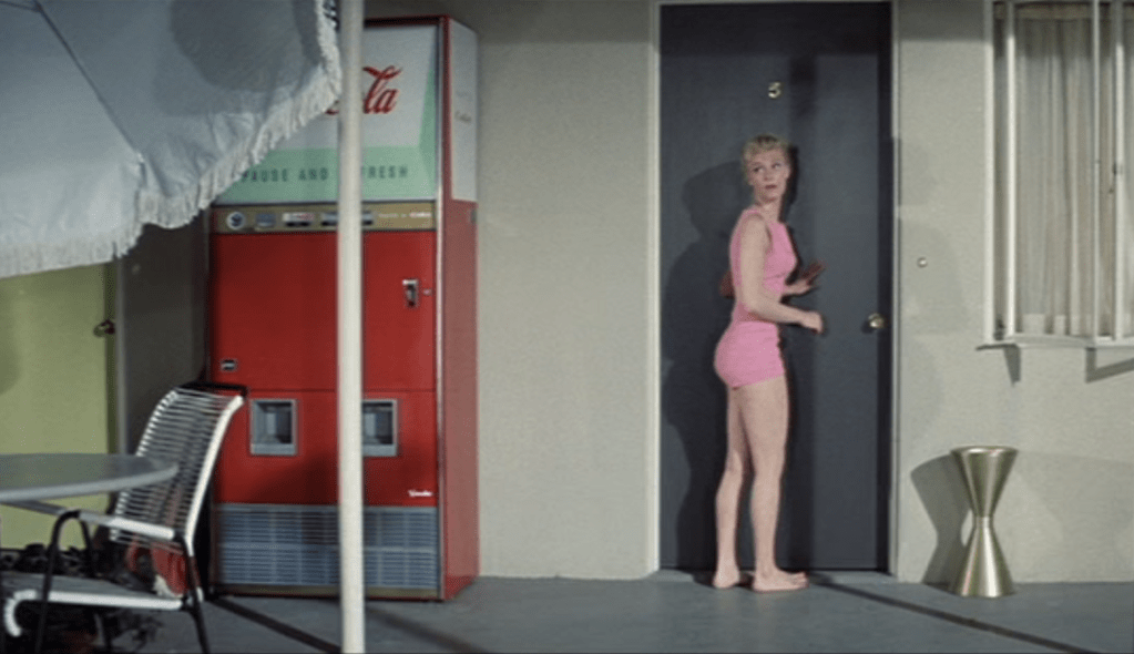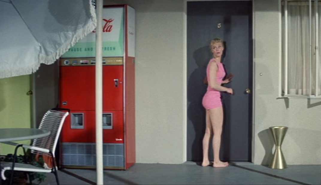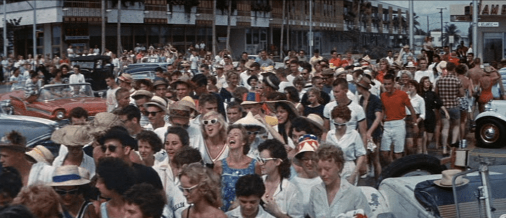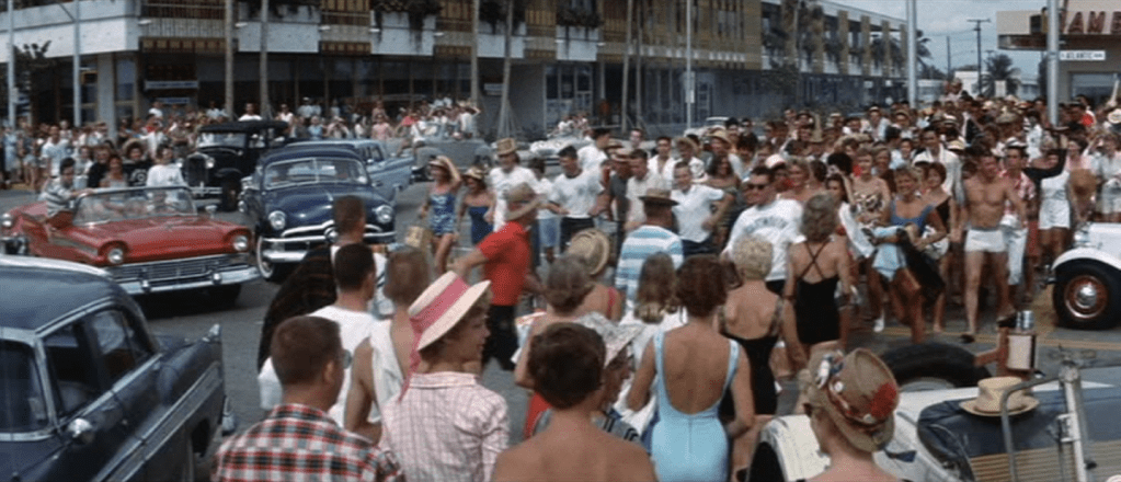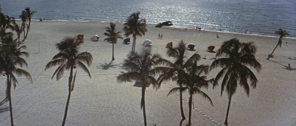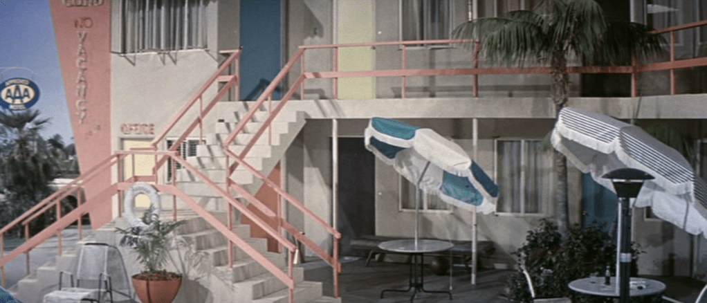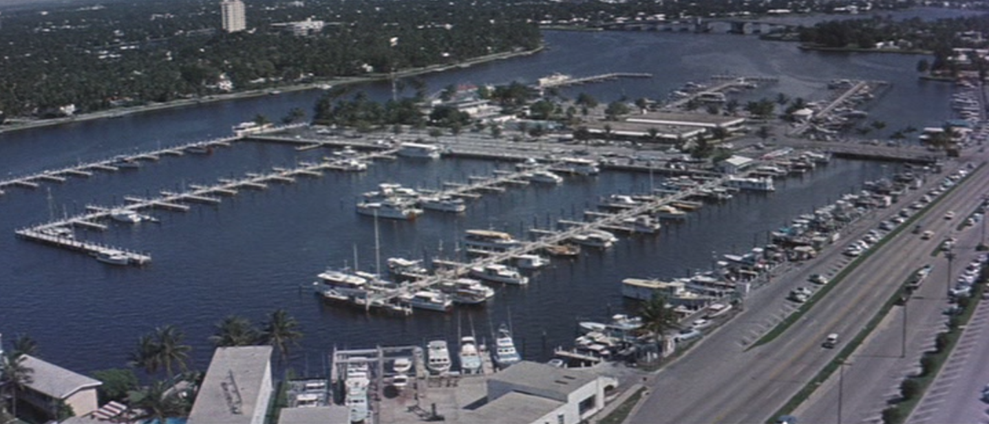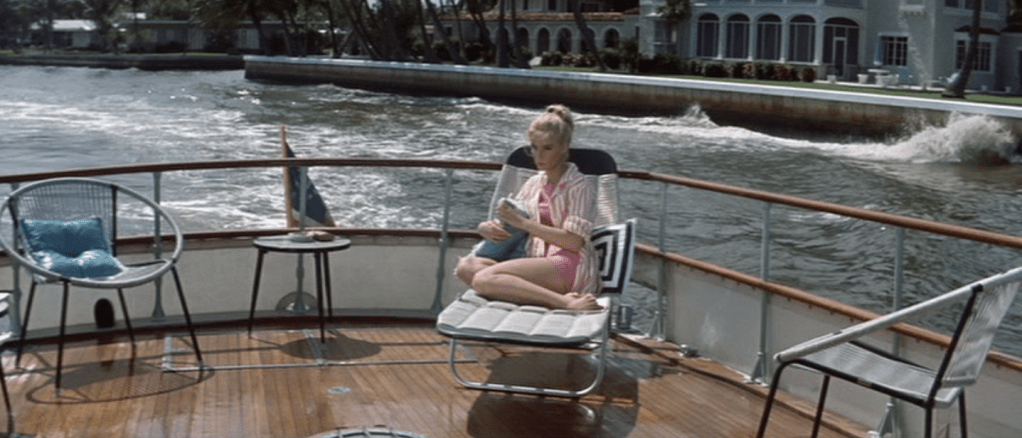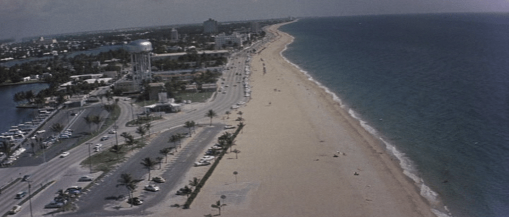 From the outset our film scores a hit with its stunning footage of Fort Lauderdale circa 1960. Just look at the opening credits – the waterways that are traversed are breathtaking. Imagine living at one of the many gorgeous homes pictured like the one with a swimming pool just feet from the water where a boat is docked. Just unreal. Many beach scenes were shot on location and the Elbo Room, a Lauderdale institution, is still located at the start of the strip at 241 South Fort Lauderdale Beach Blvd. Opened in 1938, you can still get a beer there but that’s it – no food is served. According to FloridaBeachBar.com, the place is a bit run-down today and the bathrooms are “frightening”. This place that classifies itself as a “dive bar” was the first establishment to have live video feeds available on the internet (1996) and has live music playing every minute it is open. Check it out at ElboRoom.com. The Fairview Apartments set may have been on a Hollywood backlot but, dang, I would so love to hang out there. Shoots, I would live there, plumbing or no.