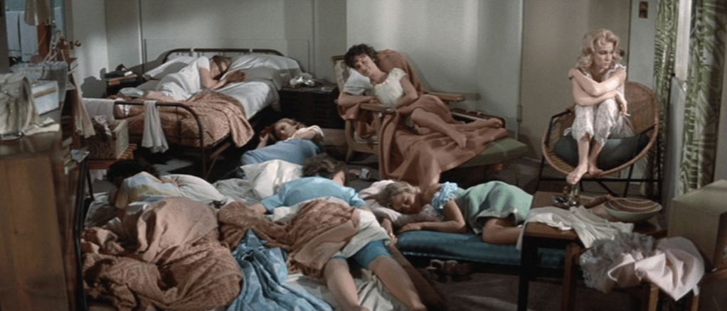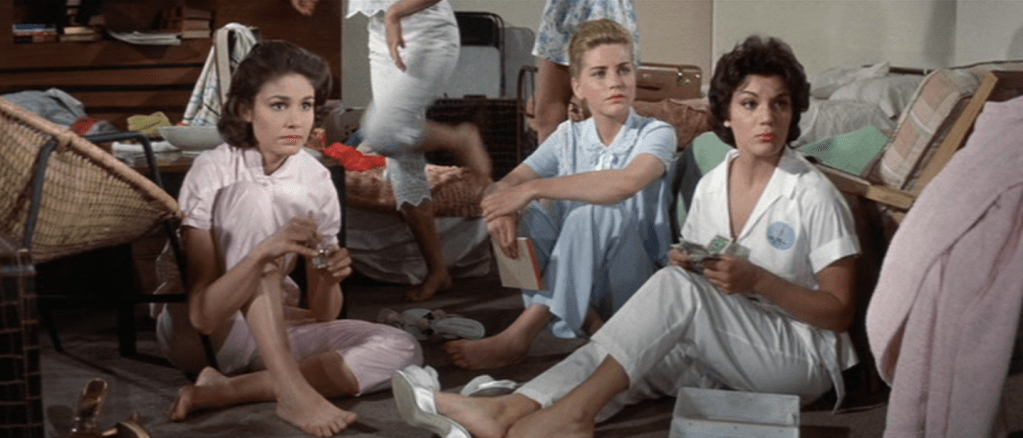 On the way down, the girls pick up a boy from Michigan State, TV Thompson (Hutton), and he and Tuggle hit it off. Once ensconced at the Fairview Apartments, the girls begin to lay out their plans for dealing with the opposite sex – and to collect stray girls who can’t afford rooms of their own. Melanie is entranced by the idea of meeting, falling in love with and marrying a boy from the Ivy League. Tuggle dates TV who begins to probe for sex and is gently rebuffed by Tuggle who is determined to find a husband the chaste way.
