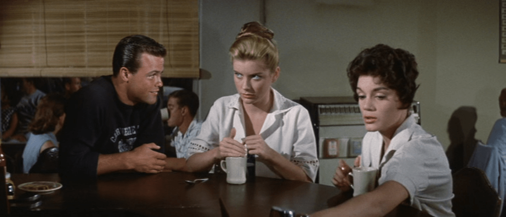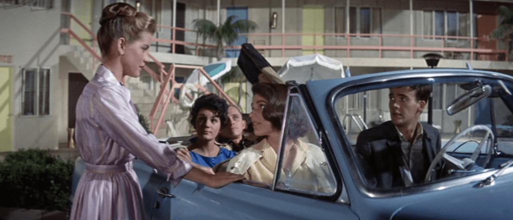 In class, Mer comes up against an old lady teacher who backs her in a corner, pumping her for her opinion on “inter-personal relationships”. Merritt’s answers – that a girl must play ball to some extent on the first date if she ever wants to have a second date – shock the teacher who sends Merritt to the dean. The dean reluctantly suggests Merritt might be expelled but holds off making a decision until after spring vacation. Merritt decides she needs to get away and joins Tuggle, Melanie and the fourth member of their group, tomboy Angie (Francis), in Tuggle’s car and the gang heads for Lauderdale.