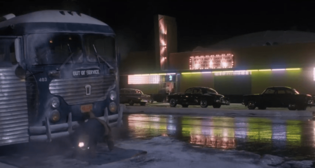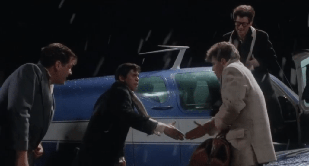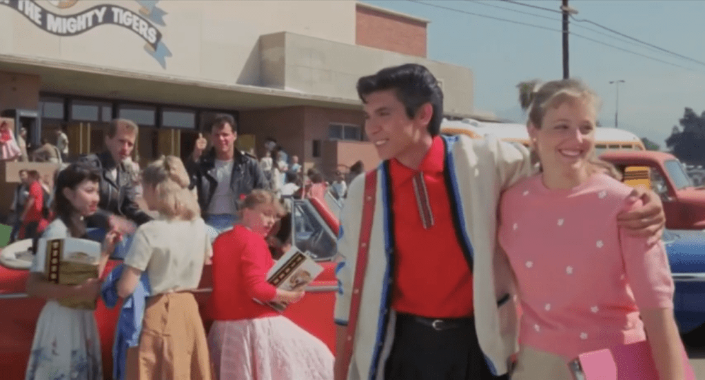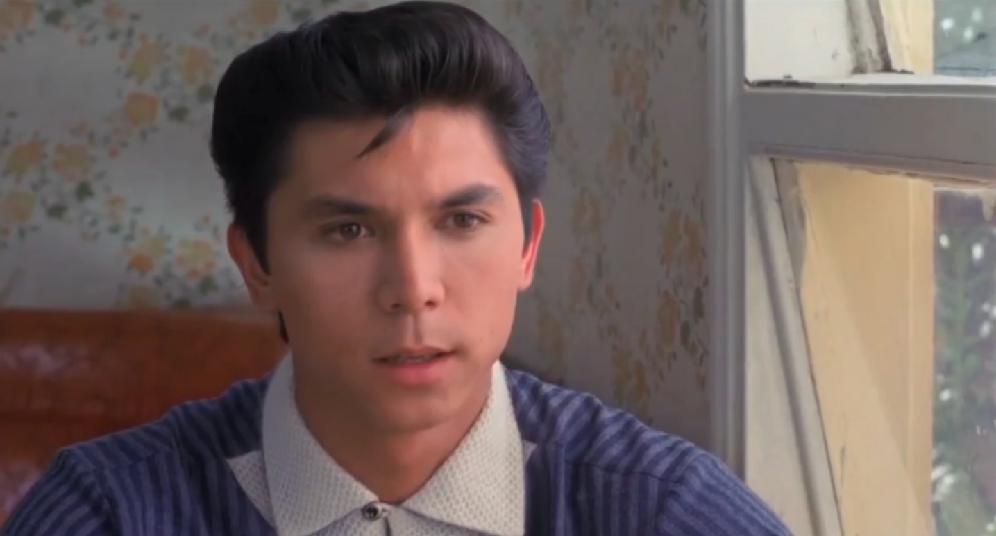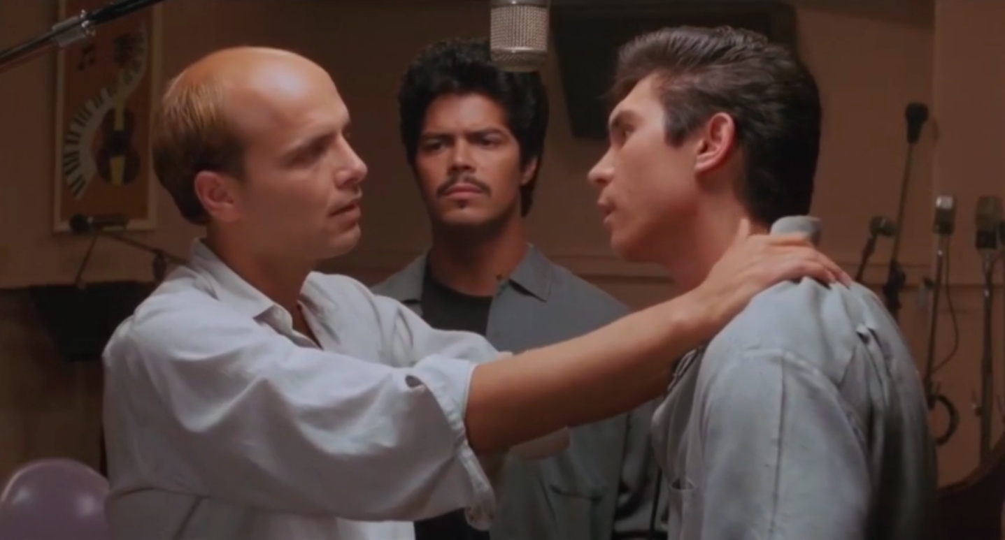There are a handful of excellent casting choices here to make note of. Jacksonville’s Rick Dees (b. 1950) plays disc jockey Ted Quillan (1930-2011), a legendary on-air personality from KFWB who did indeed mentor a young Ritchie Valens. Dees is perfect in the role in that he himself is a legendary on-air personality. While working at a station in Memphis, Rick wrote and recorded “Disco Duck”, a ridiculous – and ridiculously successful – novelty single in 1976. The song was so stupid…it went to #1. Today, Dees continues to distribute his syndicated show making it “the longest continuously running countdown featuring pop music in the world”. My number one favourite artist, Brian Setzer, plays his hero Eddie Cochran. This casting is so perfect I could bust out crying. Setzer as Cochran performs a blistering version of “Summertime Blues” in the film and shares a scene with Lou Diamond. Musician Marshall Crenshaw plays a cool Buddy Holly and both he and Howard Huntsberry as Jackie Wilson perform their numbers excellently.