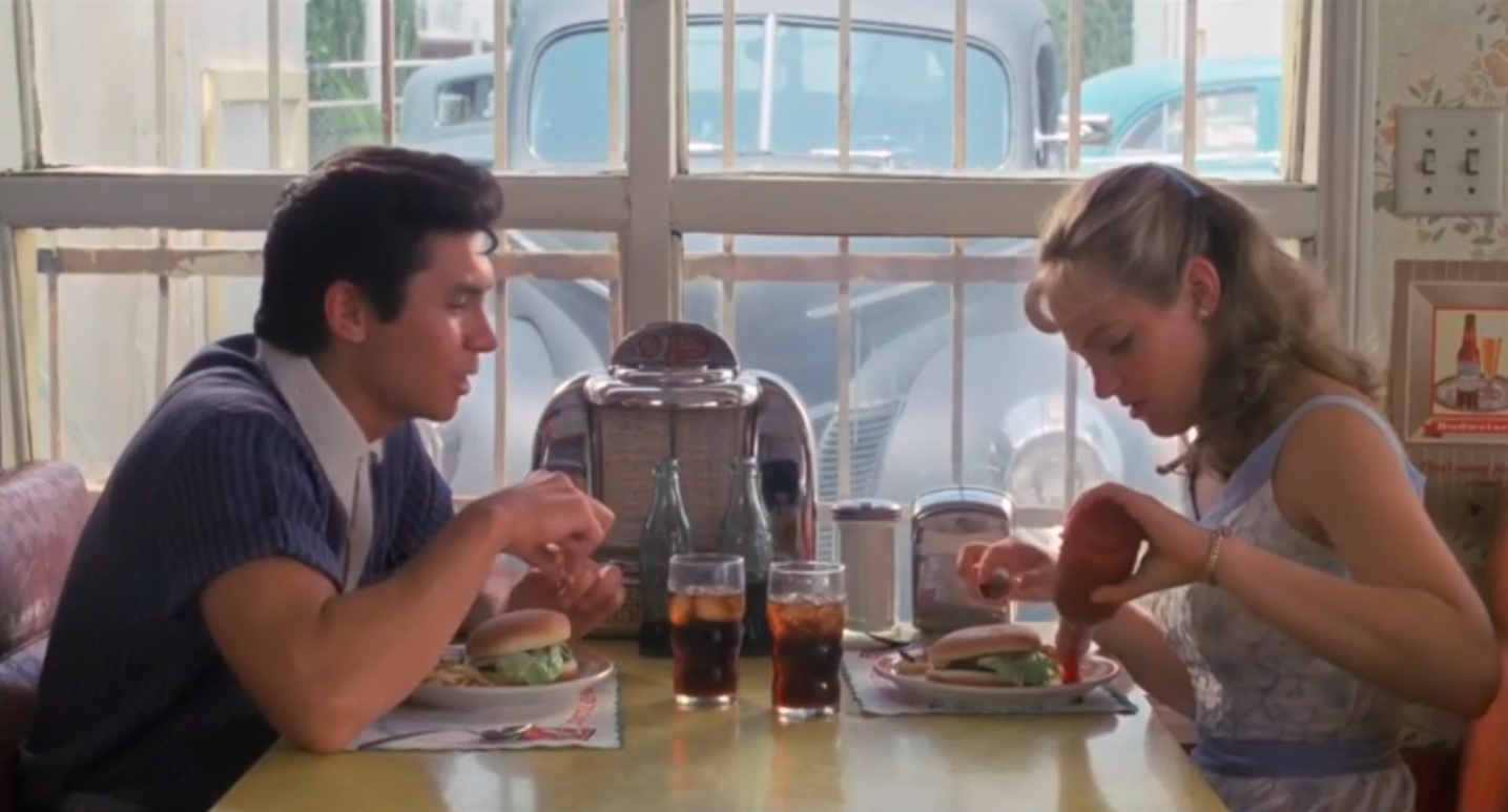Speaking of the soundtrack, producers made canny decisions when they brought in seasoned professionals to provide the music for the film. Contributing to the score is Carlos Santana and, for the music of Ritchie Valens, Hackford and Valdez contracted East L.A.’s Los Lobos. This was a no-brainer as, musically, both Santana and Los Lobos are direct descendants of Ritchie Valens. Los Lobos’ ability to play straight-ahead rock & roll shines in their versions of “Ooh, My Head”, “Come On, Let’s Go!” and particularly both “Framed”, a Leiber-Stoller tune, and “Charlena”. The soundtrack album reached Number One on the US Pop charts and topped listings in several other countries. Los Lobos cover of the title track was even more popular. “La Bamba” was a Number One song in the US, Canada, the UK and at least six other countries worldwide. Bo Diddley shows up to contribute a new version of his classic “Who Do You Love?”. Additionally, various scenes in the movie are ably fleshed out by stellar Fifties music with Santo & Johnny’s “Sleepwalk” being used poignantly.