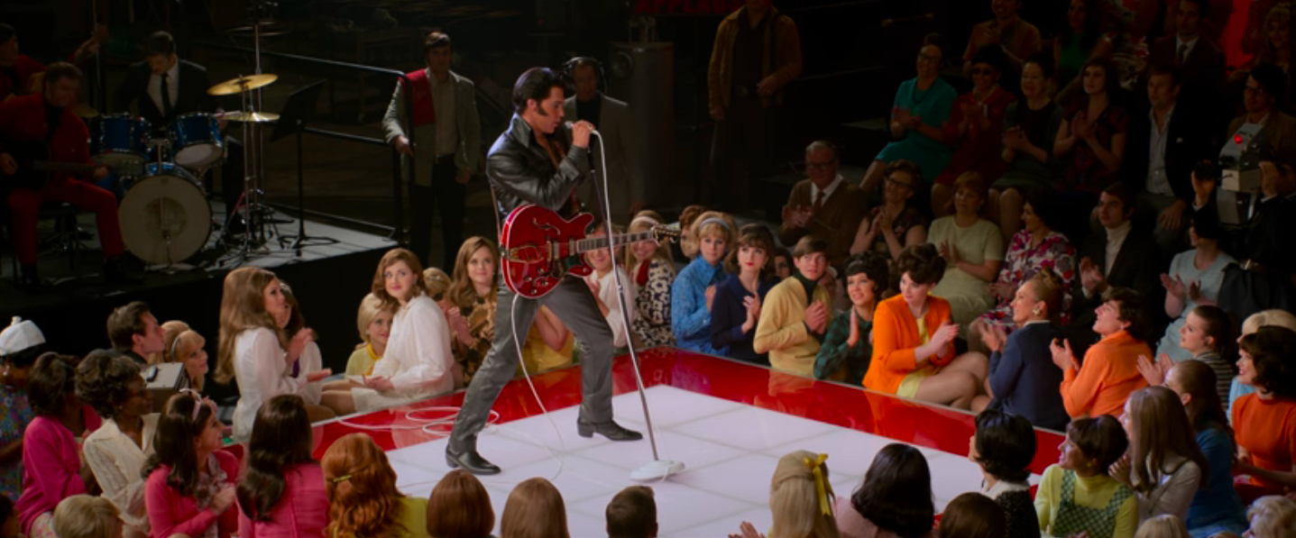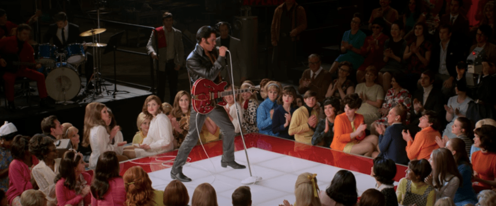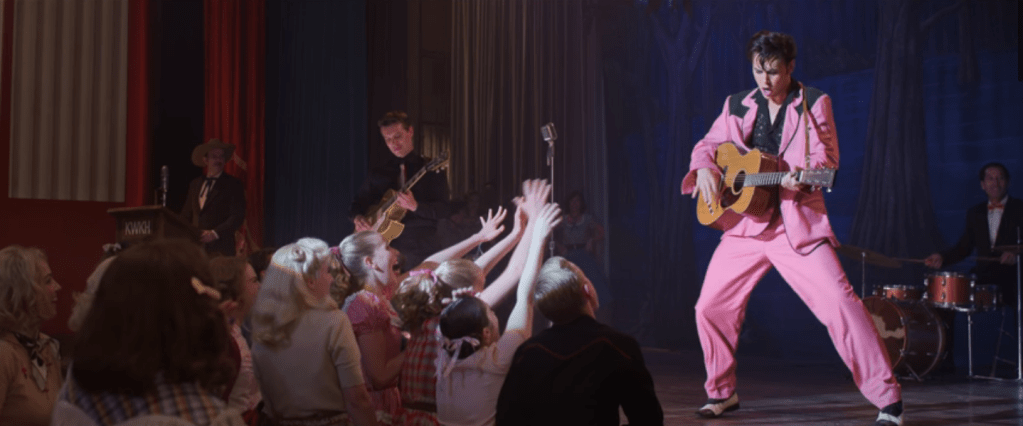 But the good things – the things the film does well and/or “gets right” – far outweigh the negatives. I enjoyed the use of the same split-screen device that was used in Elvis on Tour and the method of explaining the youthful king’s exposure to both gospel and blues is sound. This certainly was a unique fusion and the film displays it well. Explaining this fusion, in fact, is key to the whole story and key to understanding Elvis Presley and his music. For the film to have failed here would’ve been catastrophic; thankfully, this aspect is depicted cleverly and accurately. What is also depicted well is the effect of Elvis’ stage moves on the girls in the audience of the Louisiana Hayride. It is hard for audiences of today to fully comprehend the impact a performer like Presley had on people, particularly young women. Lurhmann uses a playful and comic technique but one that drives home the seismic reactions to his stage presence and allows today’s movie-goers to appreciate the phenomenon.