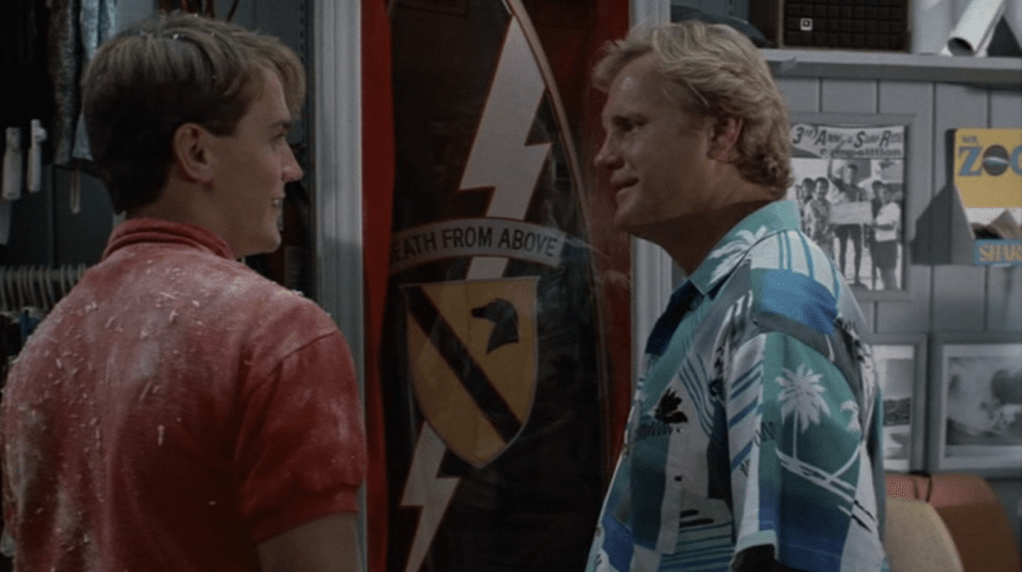Back in SoCal in the late Eighties – before the big one – there lived a surfer named Nick Rainwood (Paul). He worked at a surf shop owned by Midas (von Leer), not only boss but friend and mentor to Nick. It is Nick’s last day of work as he is heading off to study liberal arts at Stanford. Midas is sorry to see him go and gifts him with his prized possession; one of the original surfboards used in Apocalypse Now.