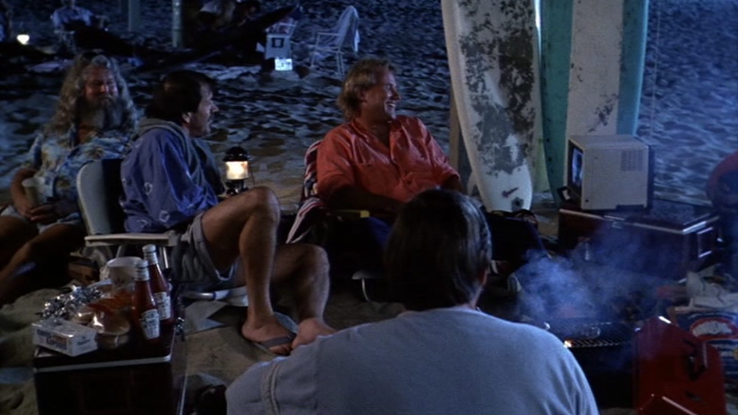 I give major points to a film that can provide lots of laughs but also some food for thought. The lifestyle is depicted so well in Under the Boardwalk and that is what my friends and I loved and what we tried to emulate back in the day. We loved the many and varied groups of surfers who gather on the beach every night. The punks party hard and live to fight. One of them rages against a metal “No Fires on the Beach” sign by throwing it into the large fire that is blazing on the beach. The Surfers for Christ are chill and spend time in prayer. But it was the Ancients we really loved and wanted so badly to be. Sonny Bono and Corky Carroll live a dream life. They sit in a group on the beach talking story and recalling the old days. They have burgers cooking on a grill and – most gloriously – have a small portable television going on which they watch The New Gidget.