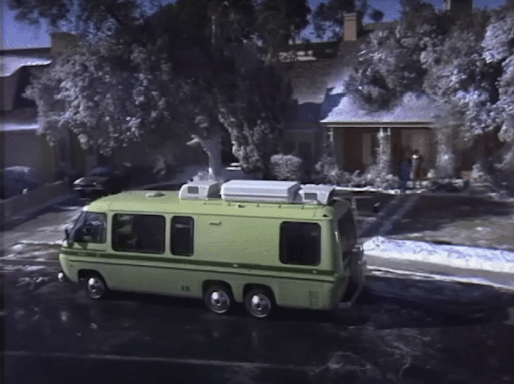 There are several little fun things to mention about this Christmas adventure with the Anderson family. At the very beginning, Jim comes in from running errands. He takes off his suit jacket – and puts on his “indoor”, more casual sport coat. Interesting to see that neighbours and even shop workers know the Anderson family so well that they all assume that the kids will be gathered for the holidays. This speaks to the example of a close-knit family the Andersons have always been. Note, too, Jim and Margaret’s embarrassment when they have to admit that the kids are indeed not coming home. It is like they are letting people down and are apologizing for this change of life. When Margaret is showing Louise around the house, she mentions that the house has no air conditioning but it is insulated. Well, I hope so. The real villain of this story – aside from time itself – is the blizzard. And where does this dastardly storm come from? Well, from the Great White North, of course. It is mentioned twice that Canada is the source of the inclement weather and the Christmas tree salesman even grumbles that he “wish(ed) those Canadians would keep their blizzards to themselves”. Sorry, eh? We’ve all had them; the idiot neighbour. Seems the Andersons have one, too. First off, the guy spills the beans that Jim is thinking of selling their home and (this may be the writer’s fault) when he is used as the device by which the family hears of the storm he says of his constant reports “I just love weather!”. Who says that?! And the flood in the kitchen? When they’re trying to sell that house? That is huge! This was played for light comedy but I would be freaking out if that was my house! Those kids need some punishment! And how about that beautiful motorhome? The GMC Motorhome was the only recreational vehicle built by a major auto manufacturer. They were in production from 1973 until 1978 and it is estimated that 9,000 of the 12,921 that were built are still in running condition today.