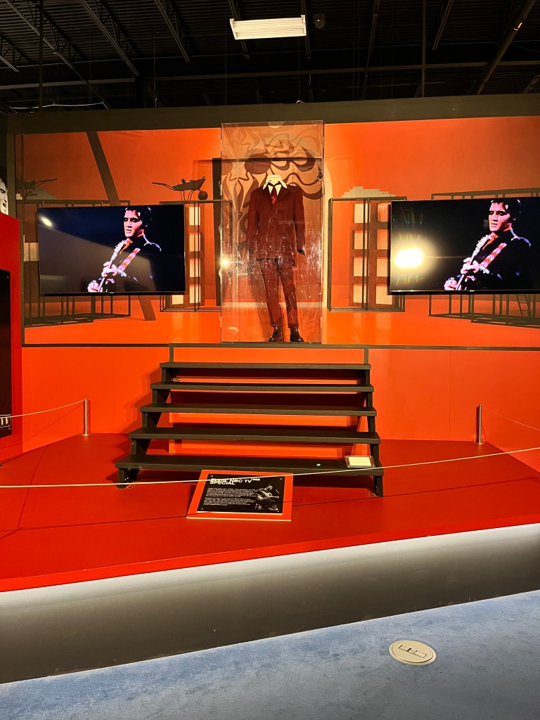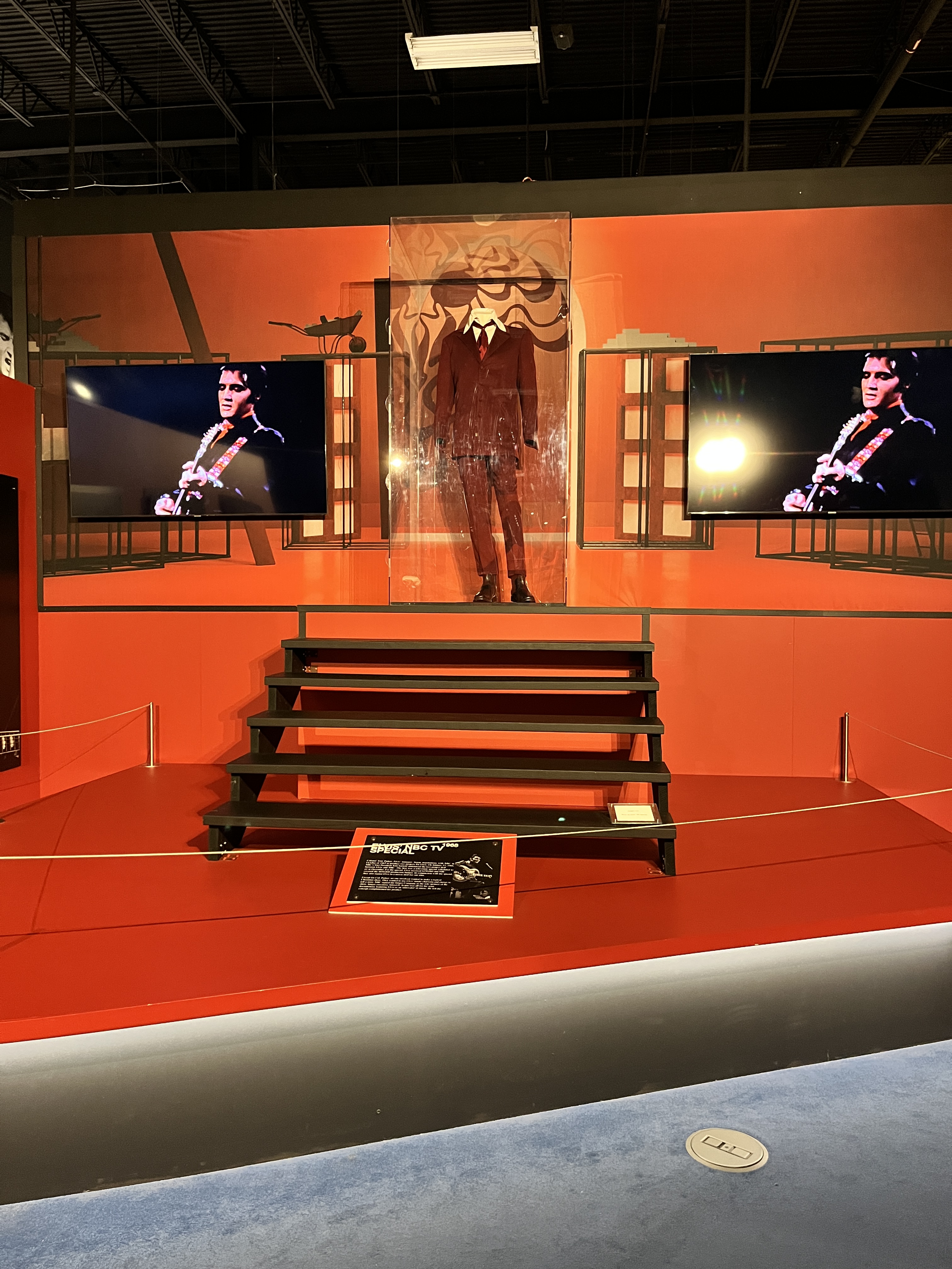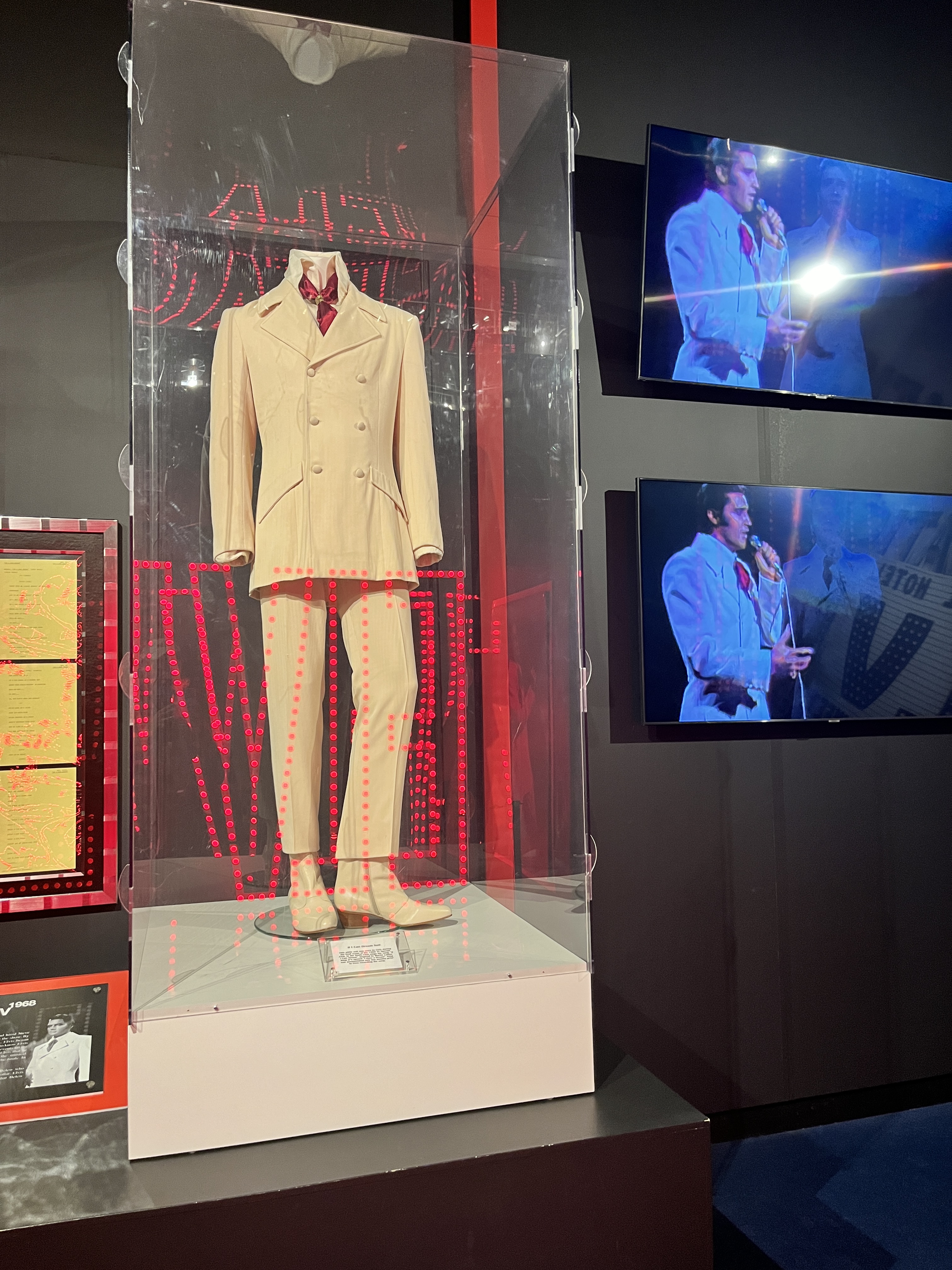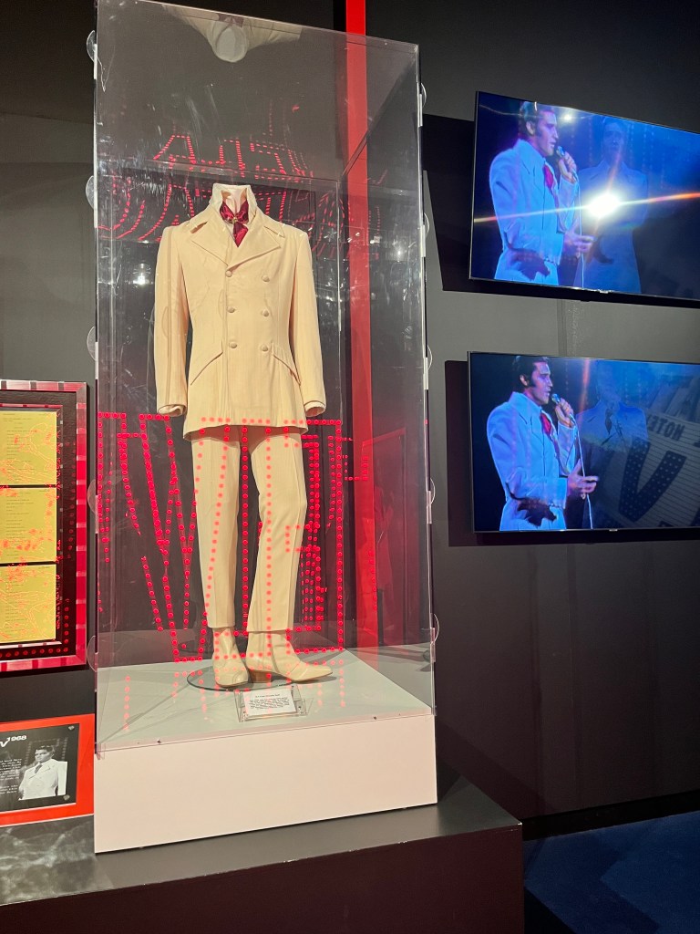 As regards the house, well, what can I say? There is nothing quite like being there and one enters into a clearer realm of understanding Elvis Presley when one spends time in Memphis and visits Graceland. Simply breathing the air in the house, feeling the thatched wallpaper, standing in the billiard room, pondering the kitchen and jungle room and considering the staircases and how they were used – all these moments bring Elvis somehow to life. You find yourself imagining the action that took place in these rooms and you recall how much Elvis loved being in his home. It makes being there, where he walked, a significant thing. When it comes to the exhibits, they are many, varied and excellent. There are exhibits devoted to the jumpsuits, the “’68 Comeback Special”, individual films, King’s time in the Army and the making of Baz Luhrmann’s Elvis movie. There are the two airplanes, the Lisa Marie and the Hound Dog II to tour and a vast collection of Presley’s automobiles to view. Sadly, there is a now a section devoted to Lisa Marie. Sad to see her clothes on display like her dad’s have been for years. In Lisa’s exhibit, even my man Jerry Schilling has a suit on display; the one he wore when he escorted Lisa to the Golden Globes two days before her death.