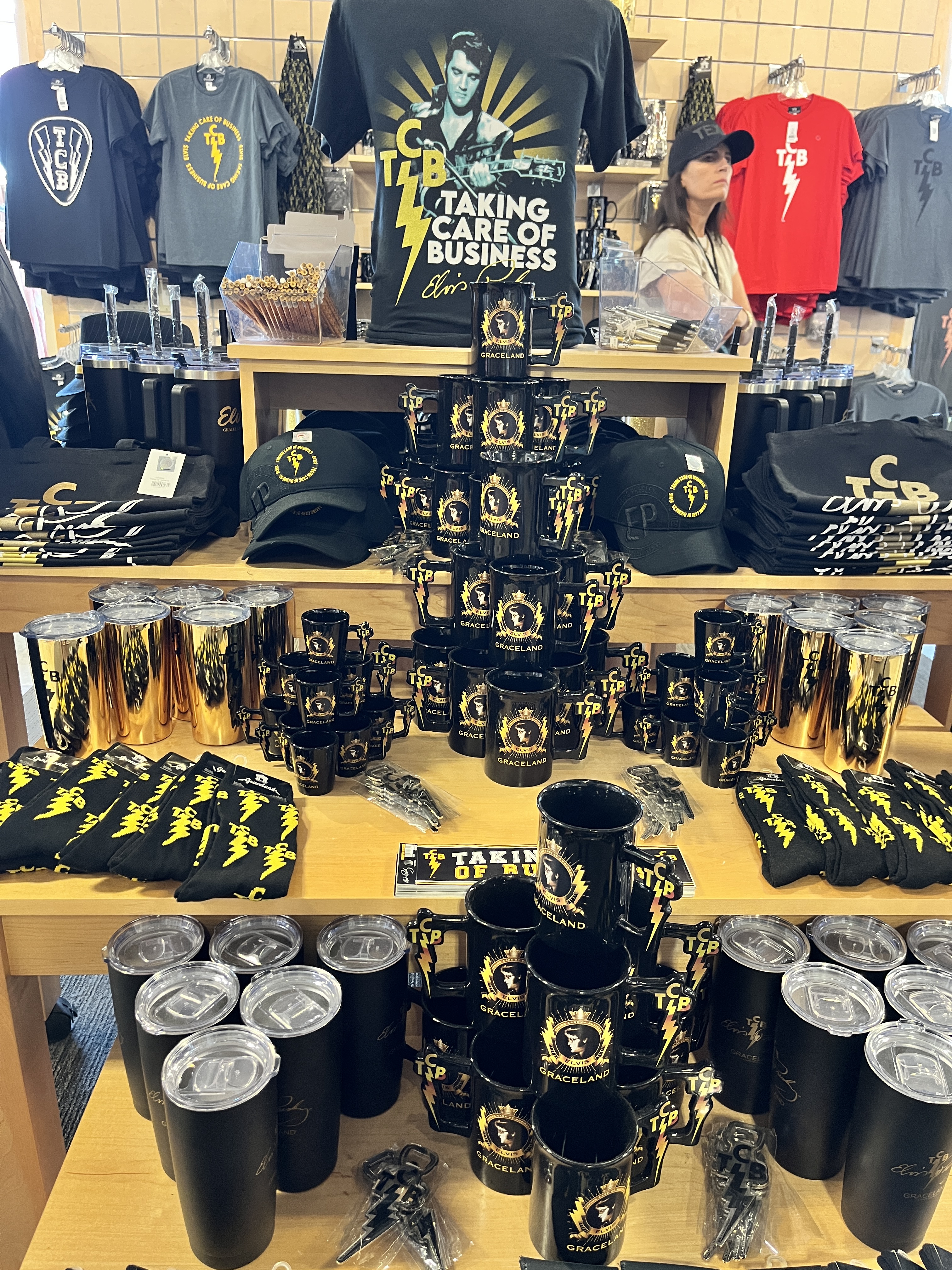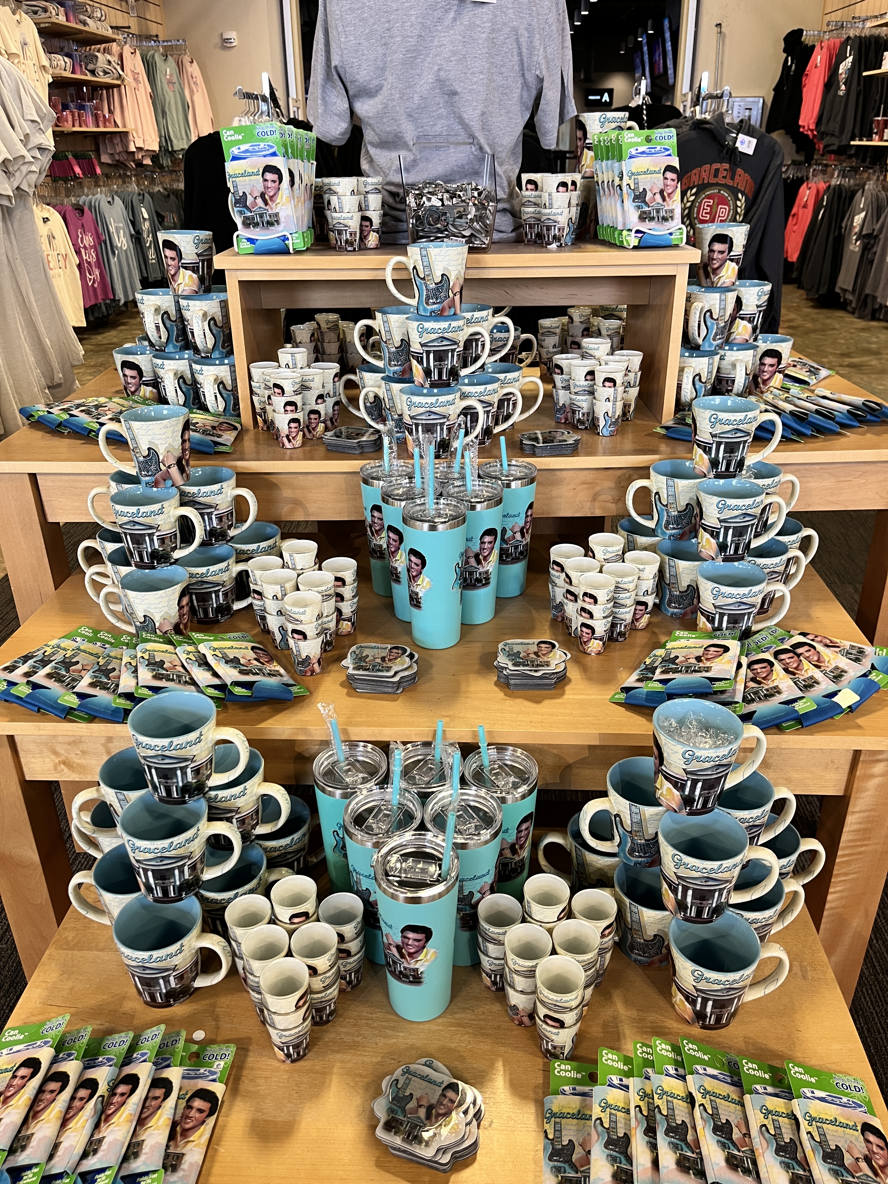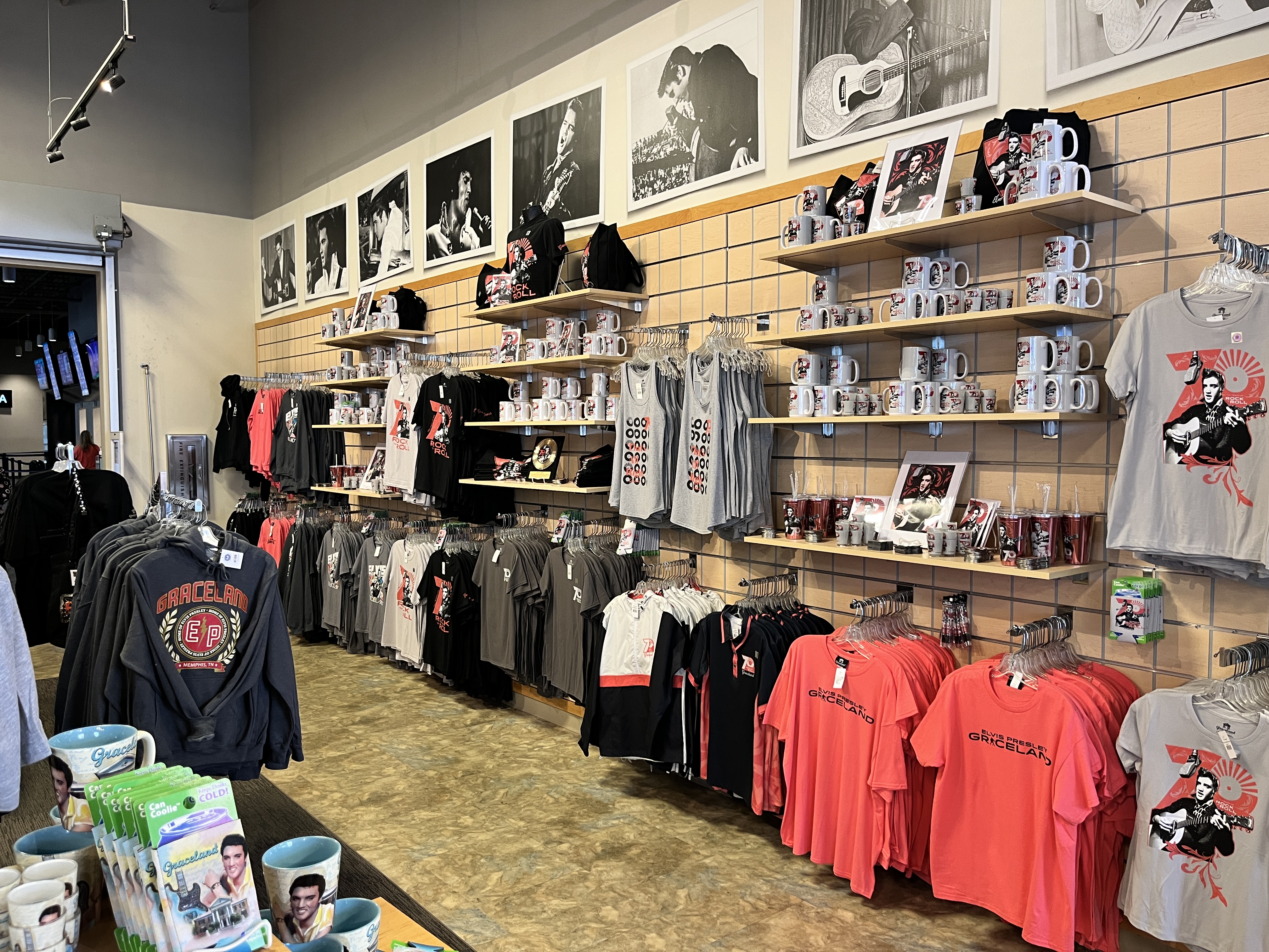 As you wait for your tour time, you can peruse the gift shop. I should say the first of a plethora of gift shops. The appeal of all this merch is subjective; I go in there and always joke out loud that they should provide carts like a grocery store. I’d like to go around and just fill my cart. The first-timer will no doubt revel in all there is to buy. Any and all items you could name are available. The Presley graphics department must be a going concern as designs are constantly being created to mark anniversaries like those for the Aloha from Hawaii special or for the recording of “That’s All Right”. There are items celebrating Graceland itself, the two airplanes specifically, the TCB insignia, specific movies and on and on. Each person will have to decide how many coffee mugs their cupboards will hold (Mine? No more) and how many hoodies they can wear (Me? No more). I’m always interested in the music for sale, the CD sets and vinyl releases that seem so expensive online with shipping added on. Like me, you may try to be a good steward of your finances but you may also – like me – consider the pricey purchases “in the budget” as you are, after all, on holiday. There is cool stuff at the various shops – you should hit them all – but things are expensive, as you would expect. (*Click on any image in the galleries to enlarge*)