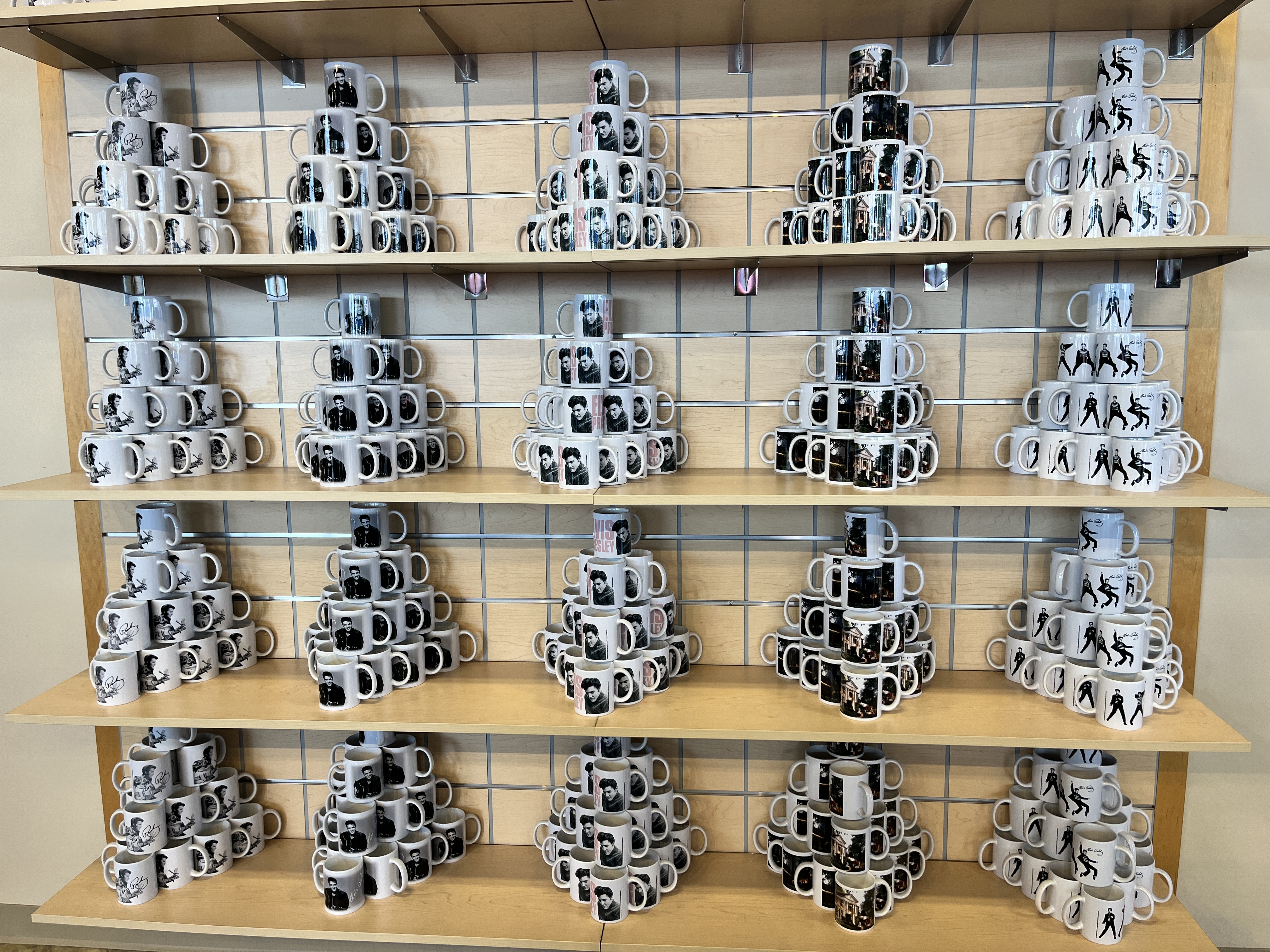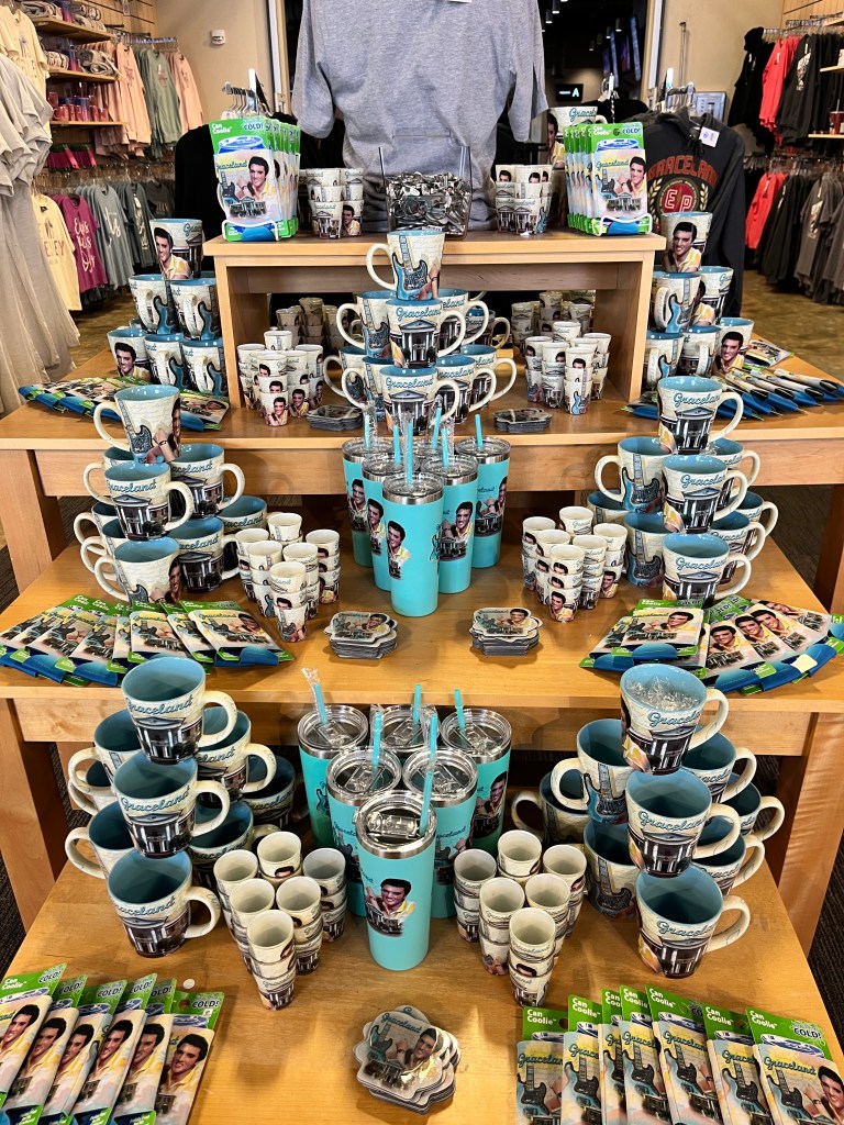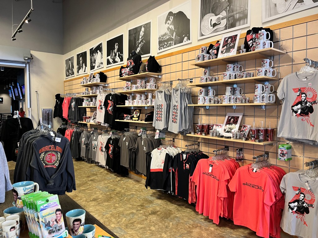 As you wait for your tour time, you can peruse the gift shop. I should say the first of a plethora of gift shops. The appeal of all this merch is subjective; I go in there and always joke out loud that they should provide carts like a grocery store. I’d like to go around and just fill my cart. The first-timer will no doubt revel in all there is to buy. Any and all items you could name are available. The Presley graphics department must be a going concern as designs are constantly being created to mark anniversaries like those for the Aloha from Hawaii special or for the recording of “That’s All Right”. There are items celebrating Graceland itself, the two airplanes specifically, the TCB insignia, specific movies and on and on. Each person will have to decide how many coffee mugs their cupboards will hold (Mine? No more) and how many hoodies they can wear (Me? No more). I’m always interested in the music for sale, the CD sets and vinyl releases that seem so expensive online with shipping added on. Like me, you may try to be a good steward of your finances but you may also – like me – consider the pricey purchases “in the budget” as you are, after all, on holiday. There is cool stuff at the various shops – you should hit them all – but things are expensive, as you would expect. (*Click on any image in the galleries to enlarge*)