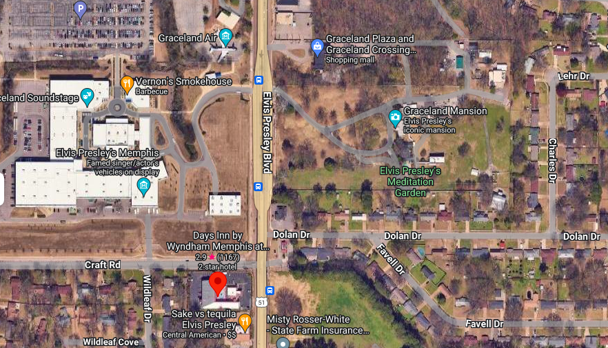 Saturday, 7:59pm CDT – We arrive before dark at the hotel we’ve always stayed at, The Days Inn Graceland, which is across the street from Graceland and across the street from the Elvis Presley’s Memphis exhibit buildings. See map below.